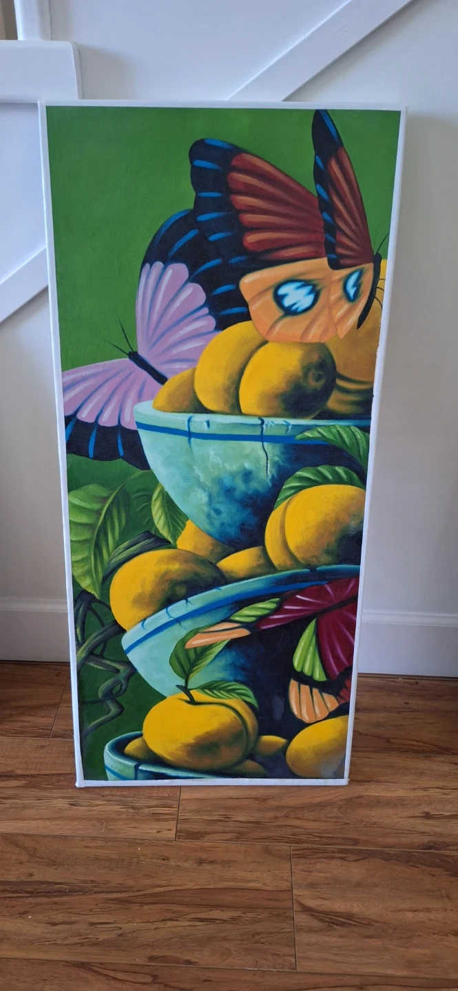 A vibrant oil painting depicts a still life composition with a collection of yellow fruits in blue bowls, accented by colourful butterflies and green foliage. This artwork would bring a pop of colour to any room!