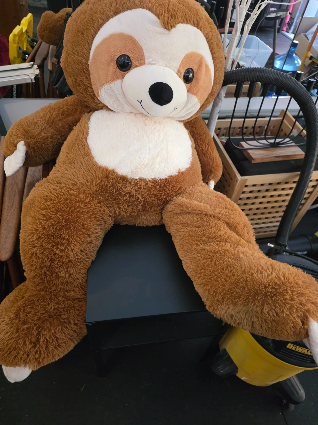 Super soft and cuddly giant sloth plush toy. Its big size makes it perfect for hugging and as a room decoration. Plush material. Clean no bugs no smells . Given to my new grand baby as a gift.Don't have the space.