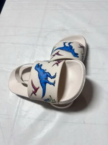 The Primark baby flip-flop sandals with a beige dinosaur print are perfect for summer and spring days at the beach. Featuring a slip-on closure and a comfortable rubber outsole, these sandals are easy to put on and ideal for casual occasions. The unisex toddler size 7 sandals have a unique animal print design with strap accents, making them both stylish and practical for active little ones. Made with blended fabric and synthetic upper material, these flip flop sandals are a must-have addition to your child's summer wardrobe.