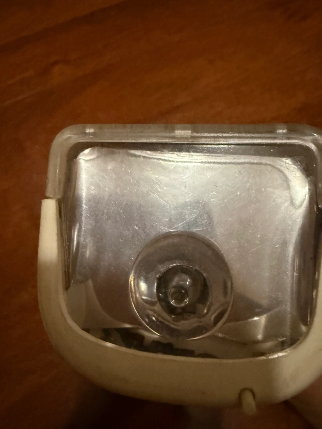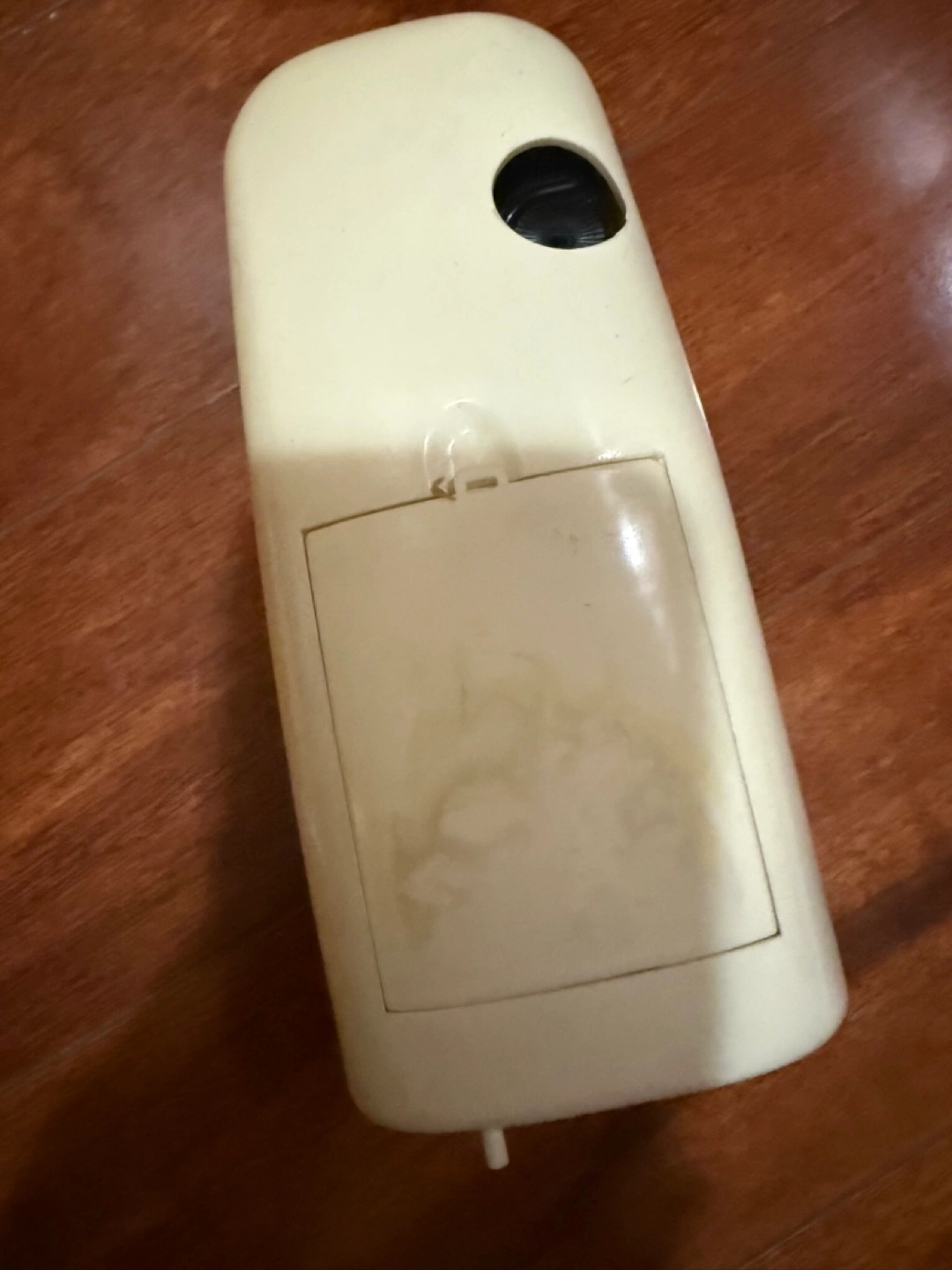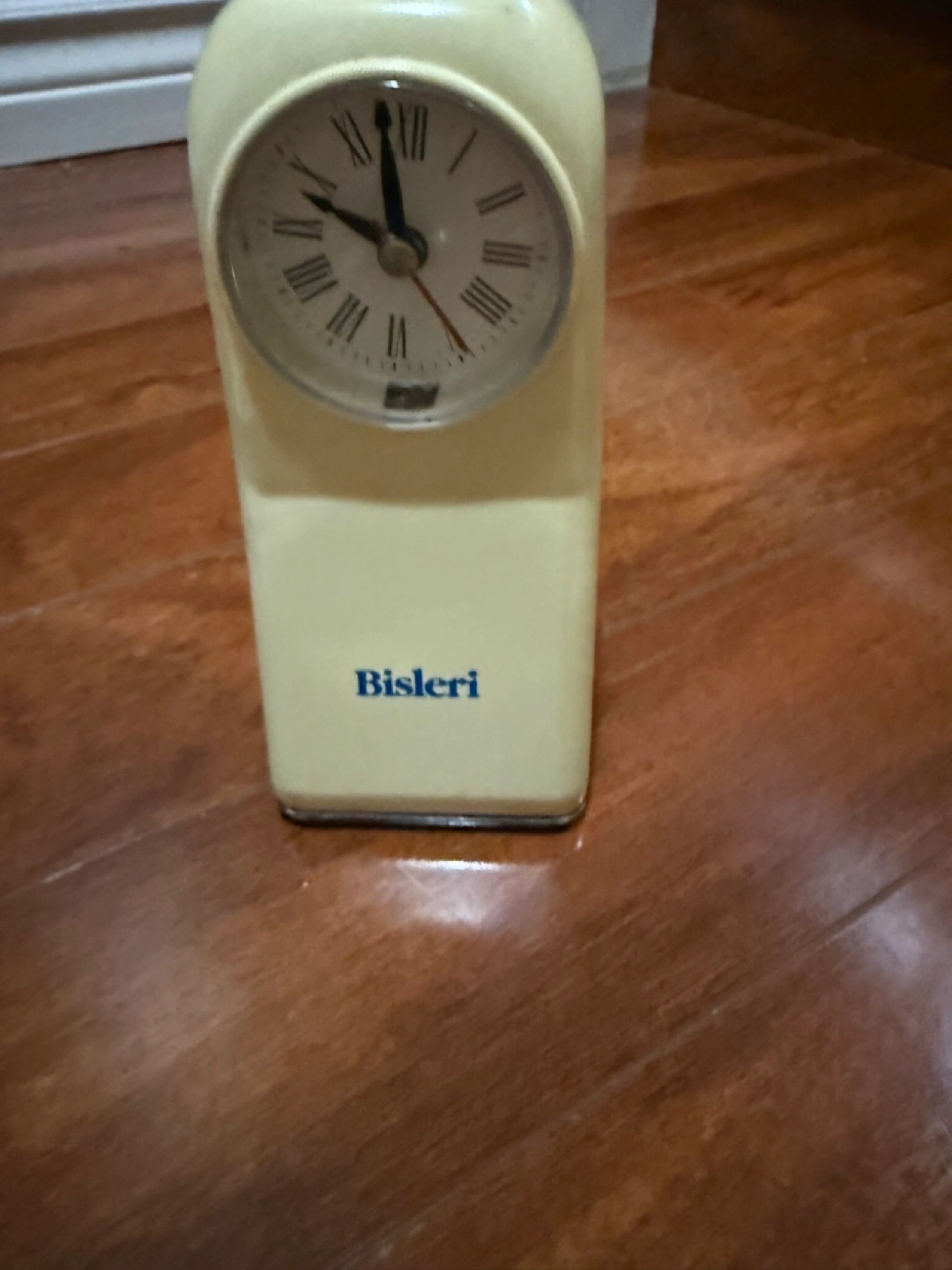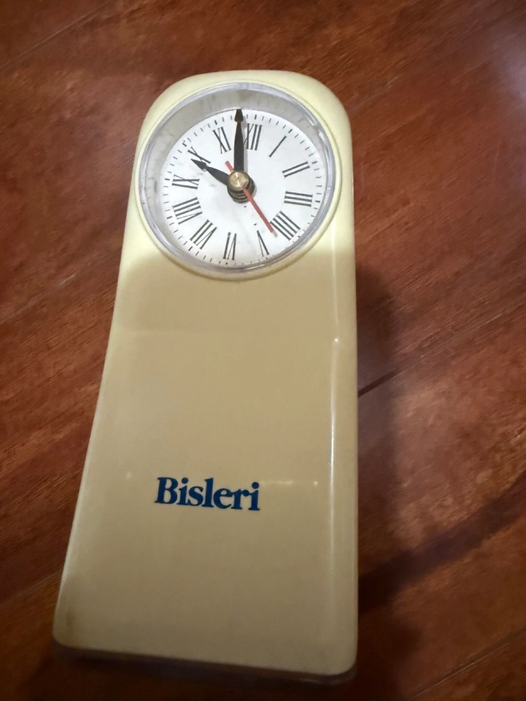 This is a Bisleri desk clock with a vintage look. It has Roman numerals on its face and a simple cream-coloured casing. Battery compartment on the back.