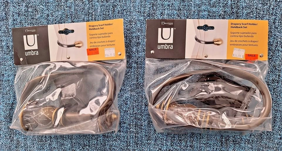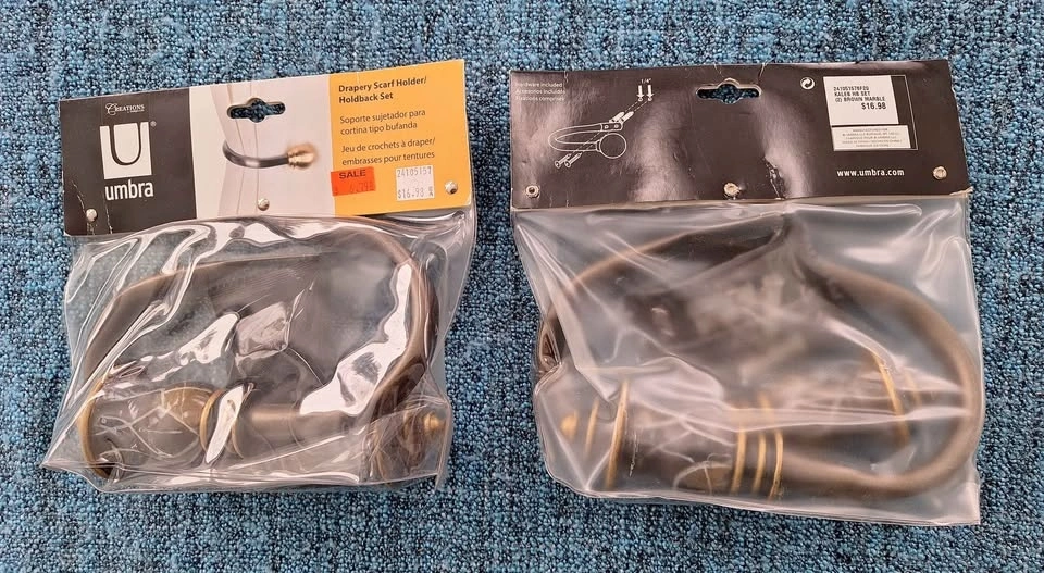 2 pairs of Umbra Scarf Holder / Holdback Sets in brown marble tone. Packaging never opened, sealed with hardware included. $5 each pair. Pick up in the Bloomington and 9th line area.