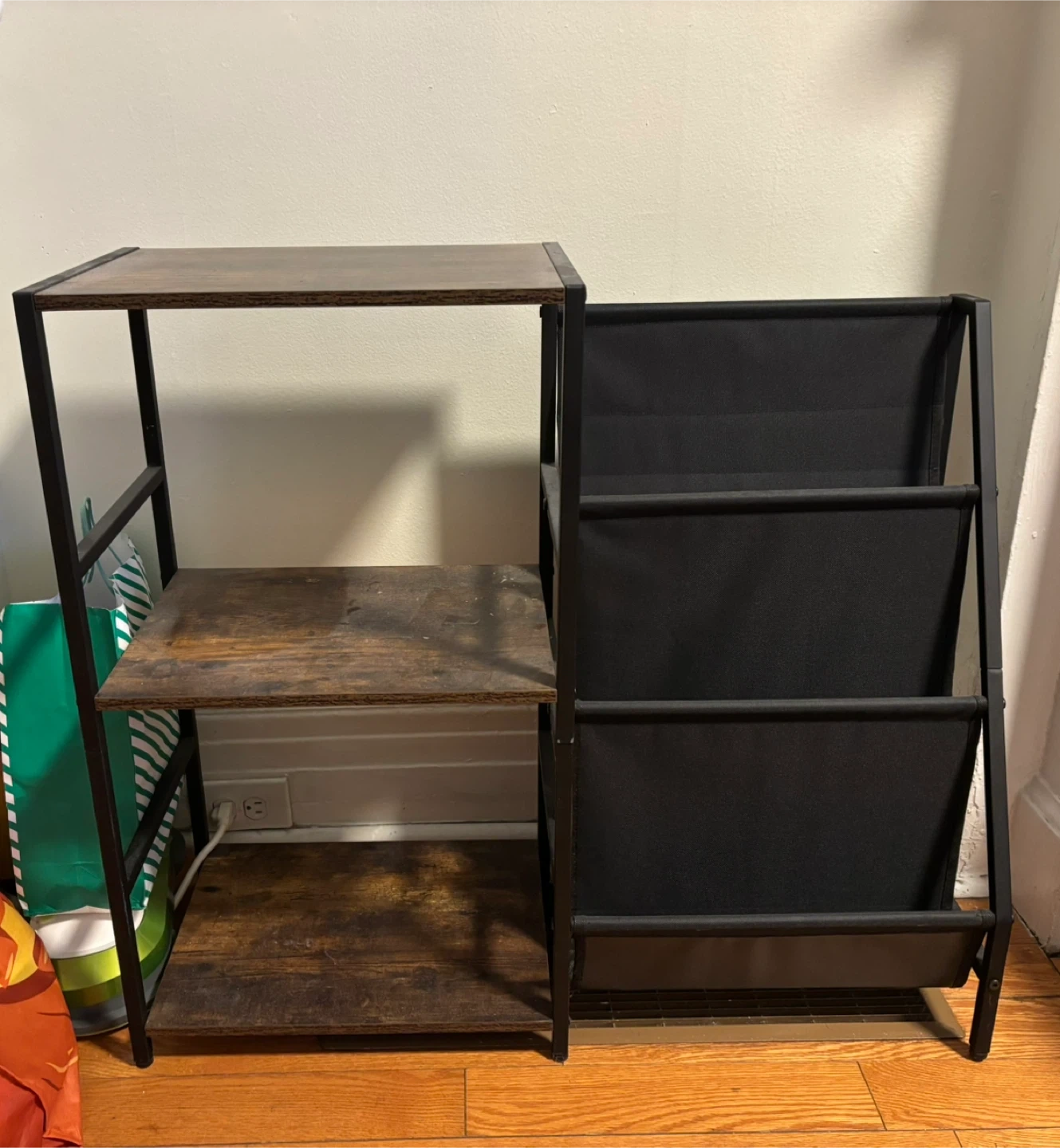 This bookshelf features a rustic wood design with black metal framing. It has three shelves for storage and a fabric magazine rack on the side. It's a great piece for organizing books or displaying decor. Personally I used it to display my record player and vinyl collection!