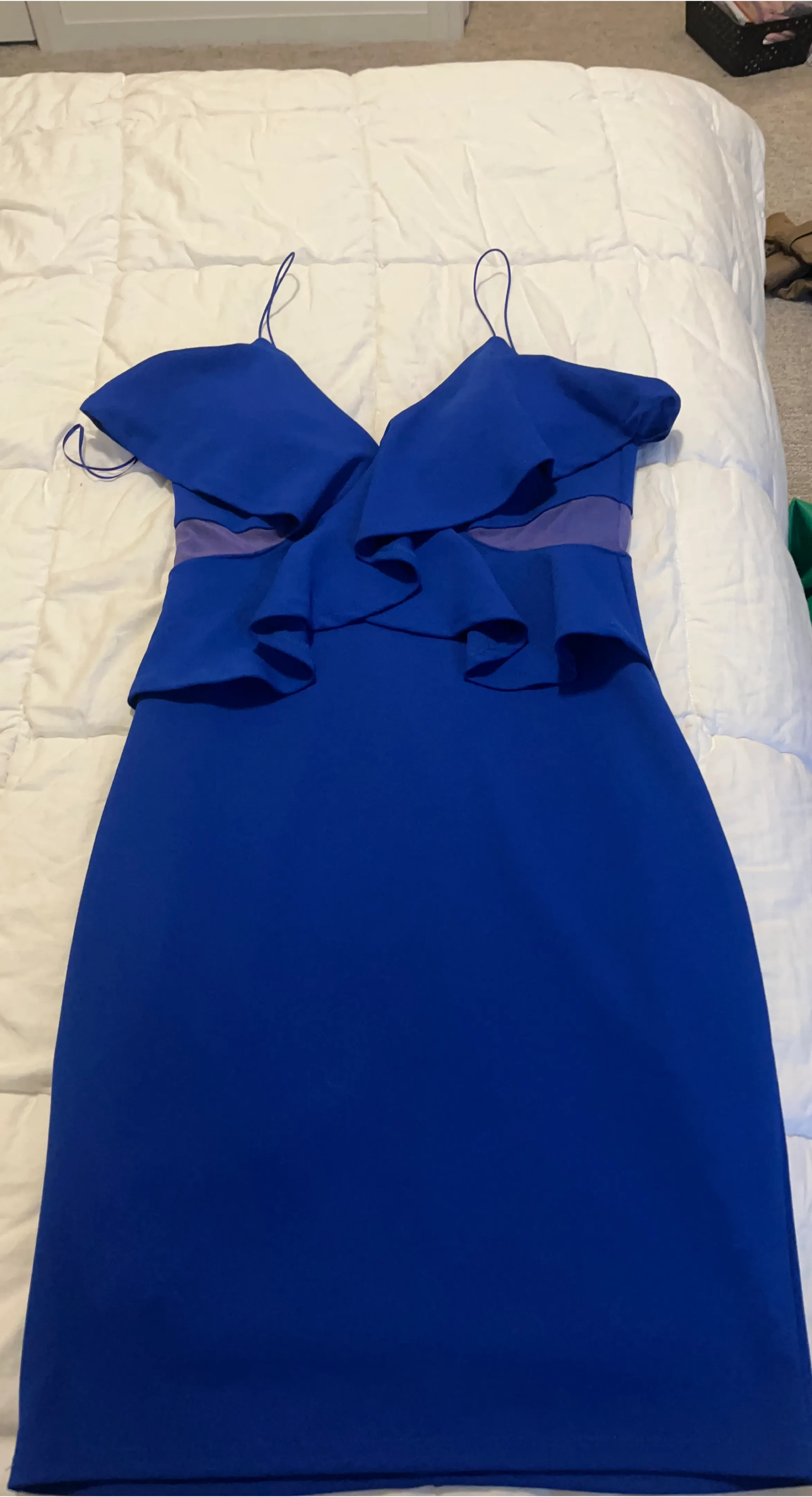A stylish royal blue dress from Revamped. It features a flattering ruffle detail and a sheer panel at the waist. This dress is size medium and made in China. Perfect for a night out!