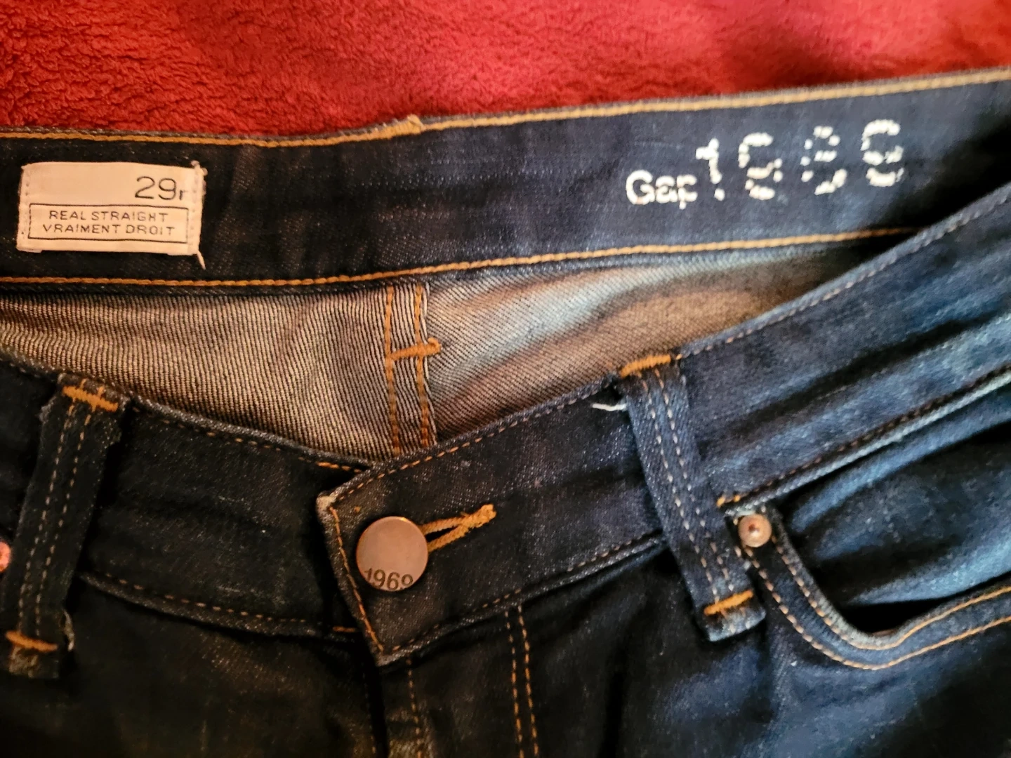 These are Gap 1969 Real Straight jeans in a dark wash denim. They're a size 29 waist. This classic style is great for everyday wear.