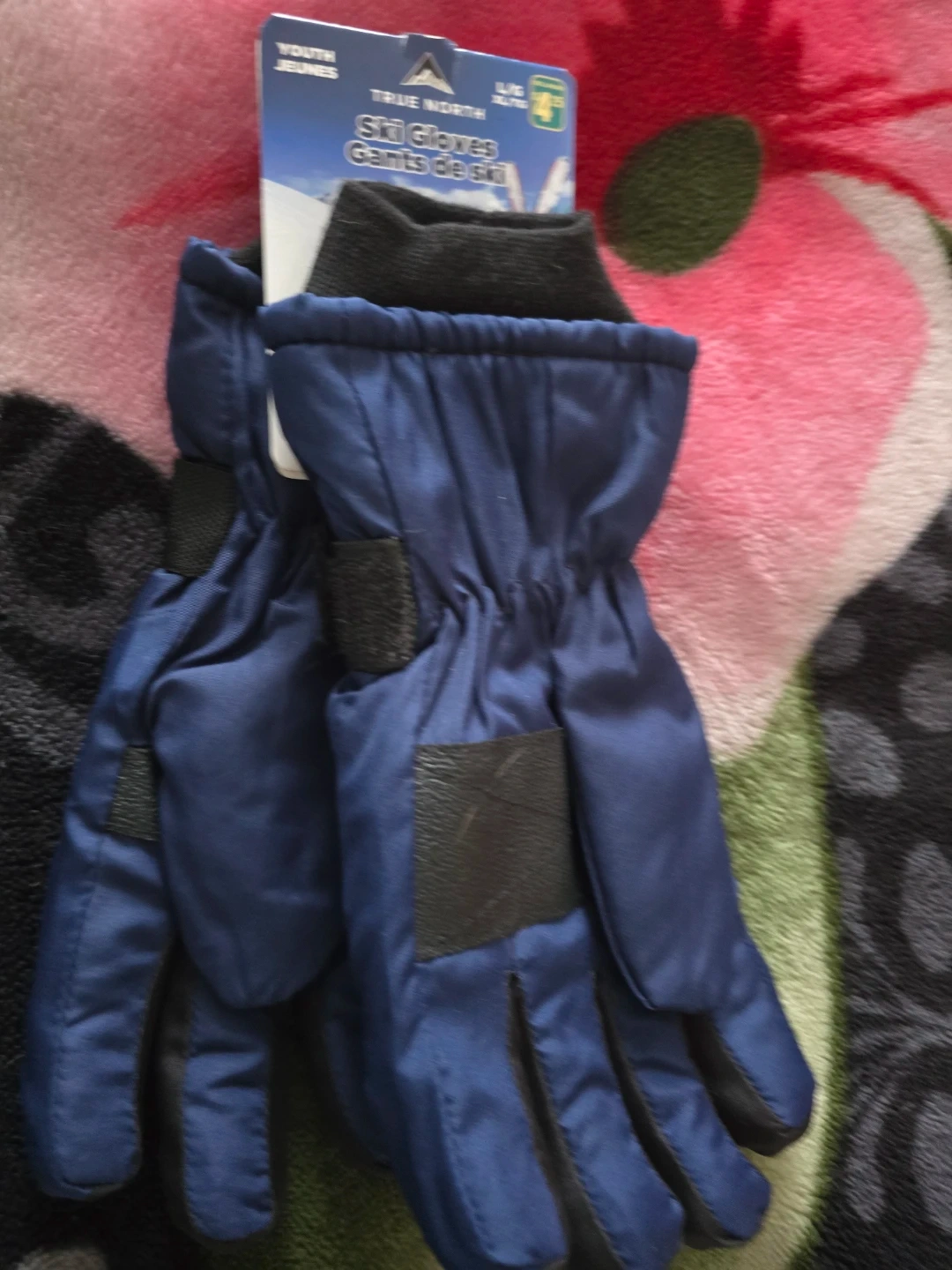 These True North ski gloves are designed for youth. They're blue with a black cuff and adjustable strap for a secure fit. Made for keeping hands warm during winter activities.