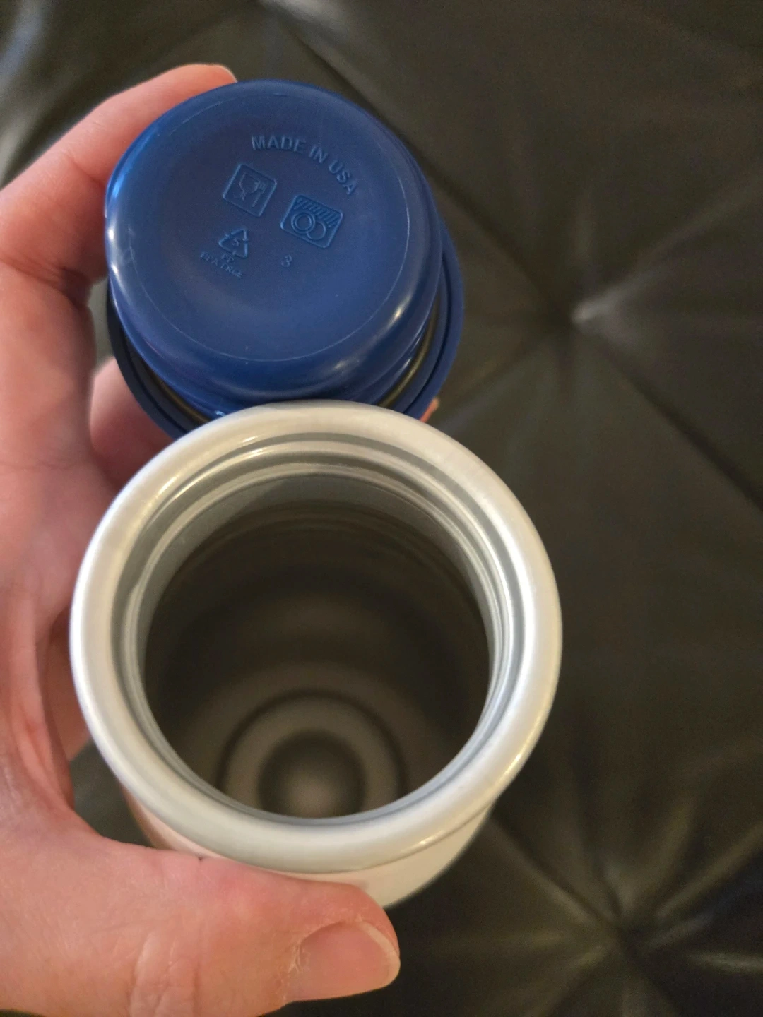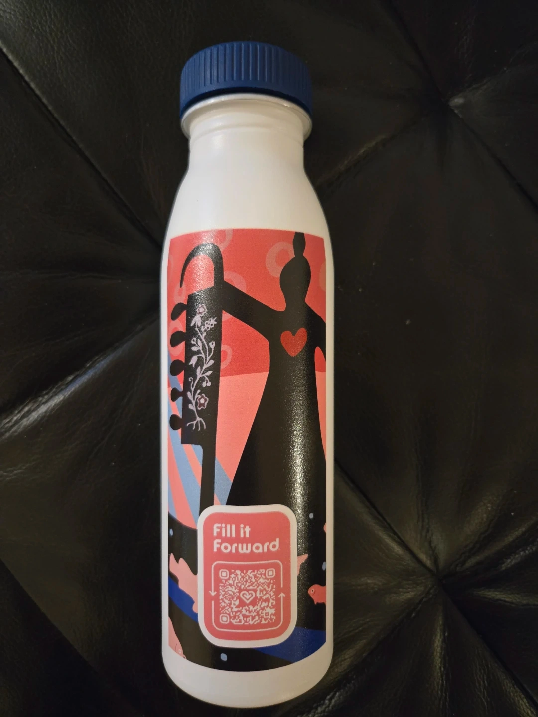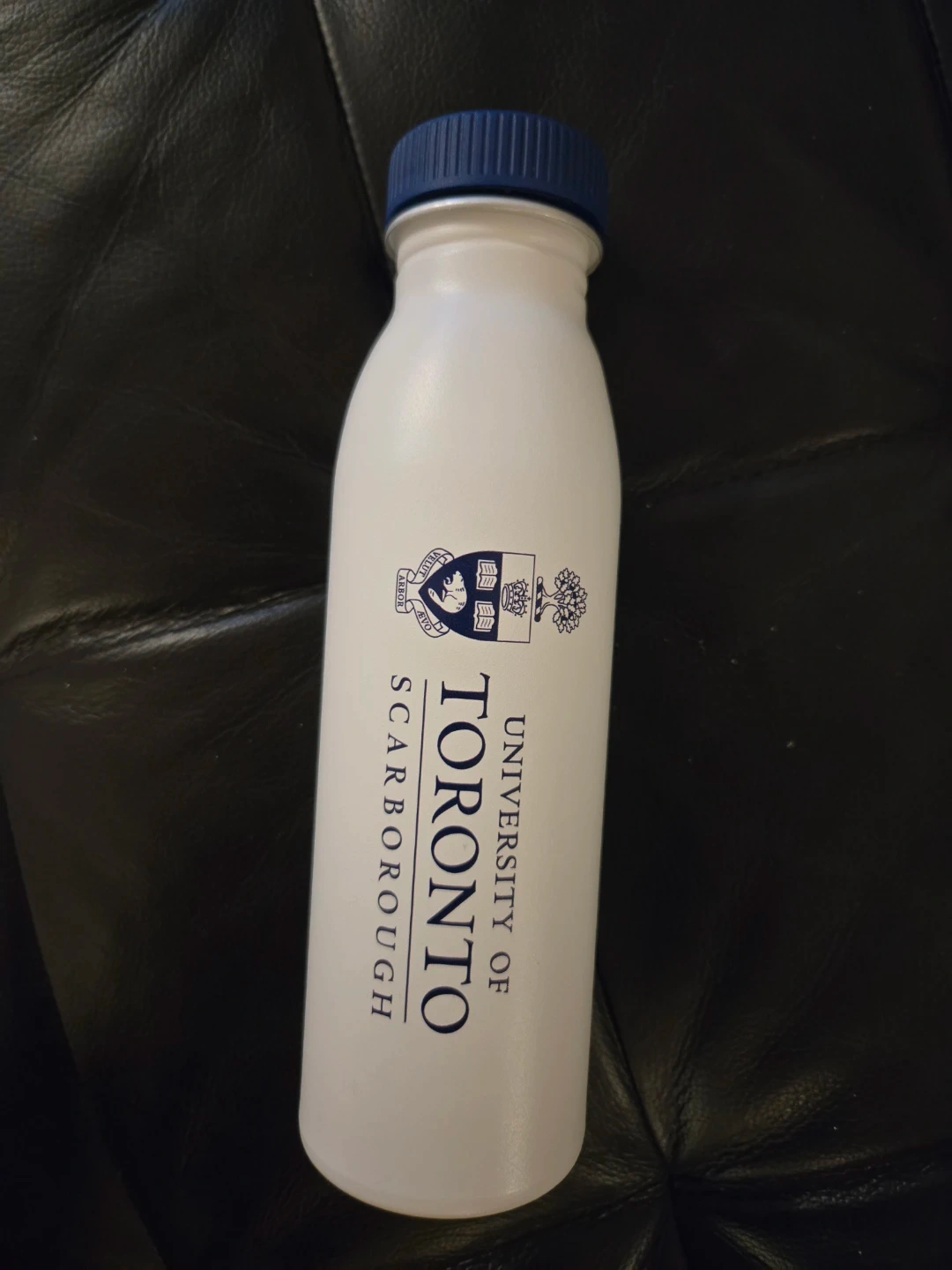 This white reusable water bottle features the University of Toronto Scarborough logo. It has a blue screw-on lid and decorative artwork on the side.