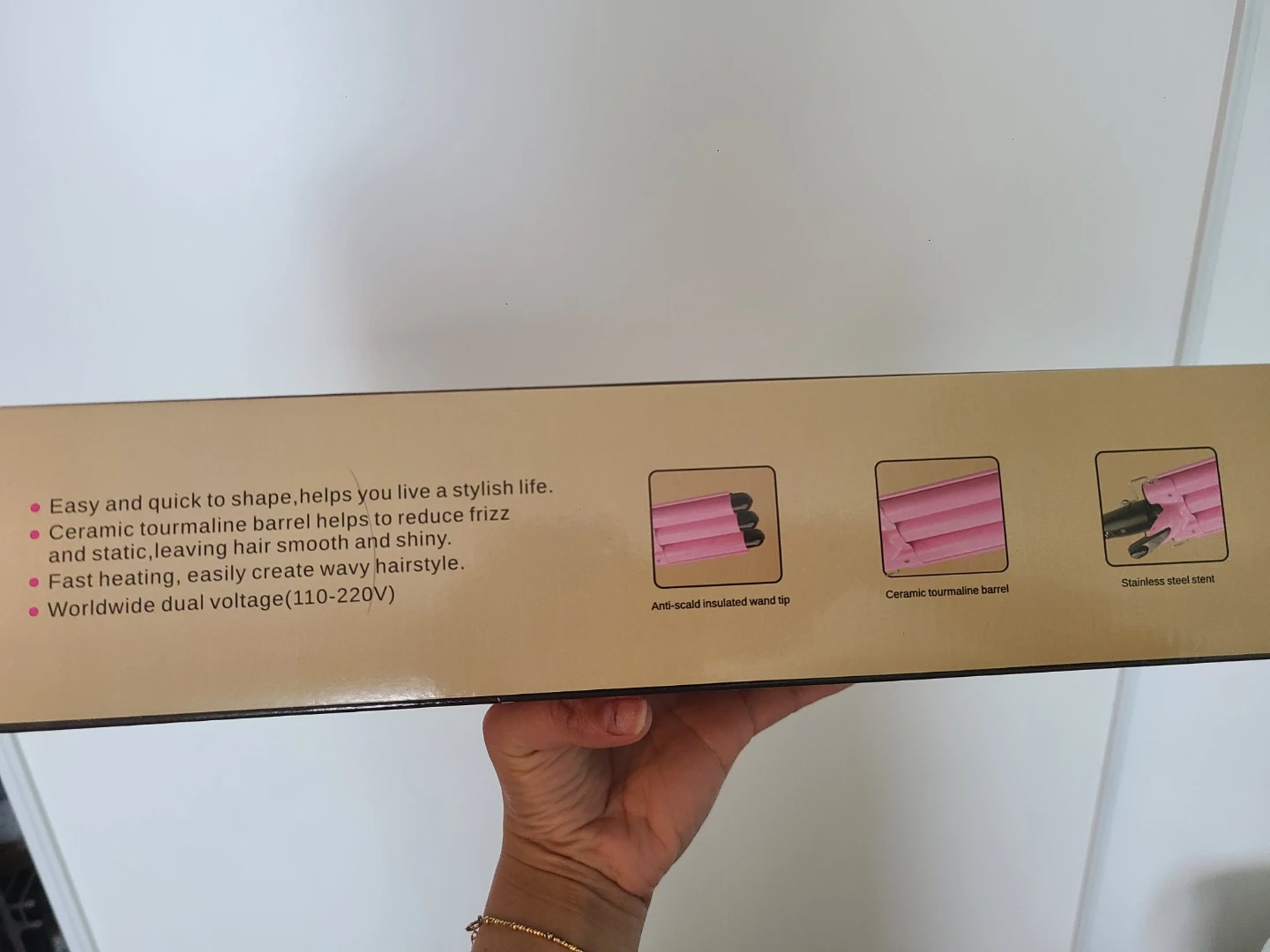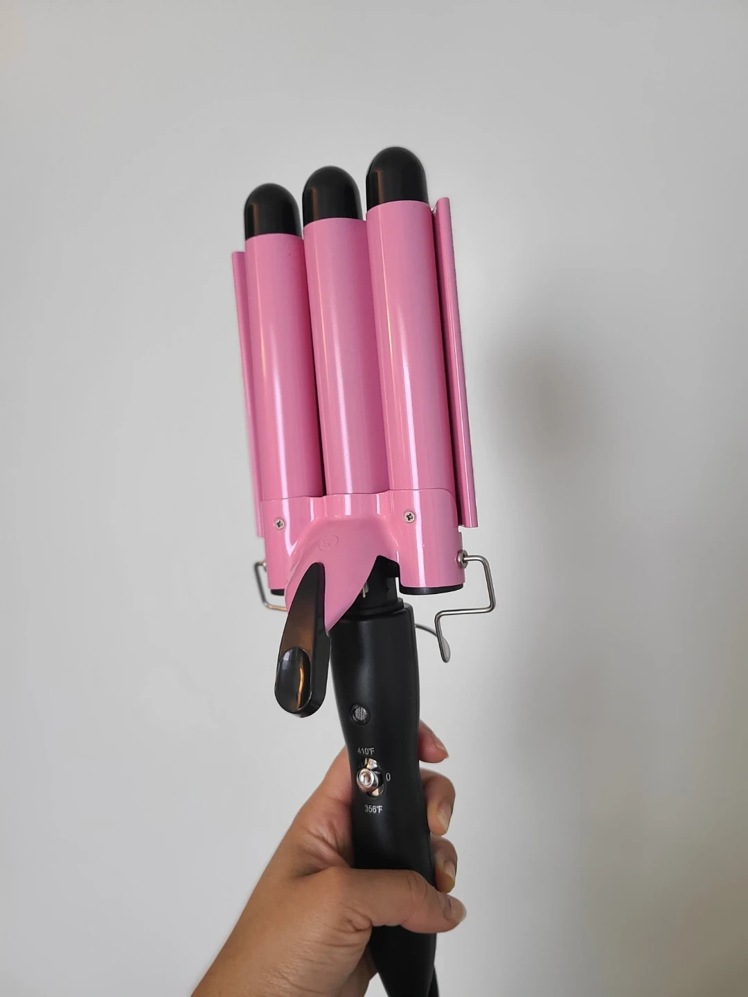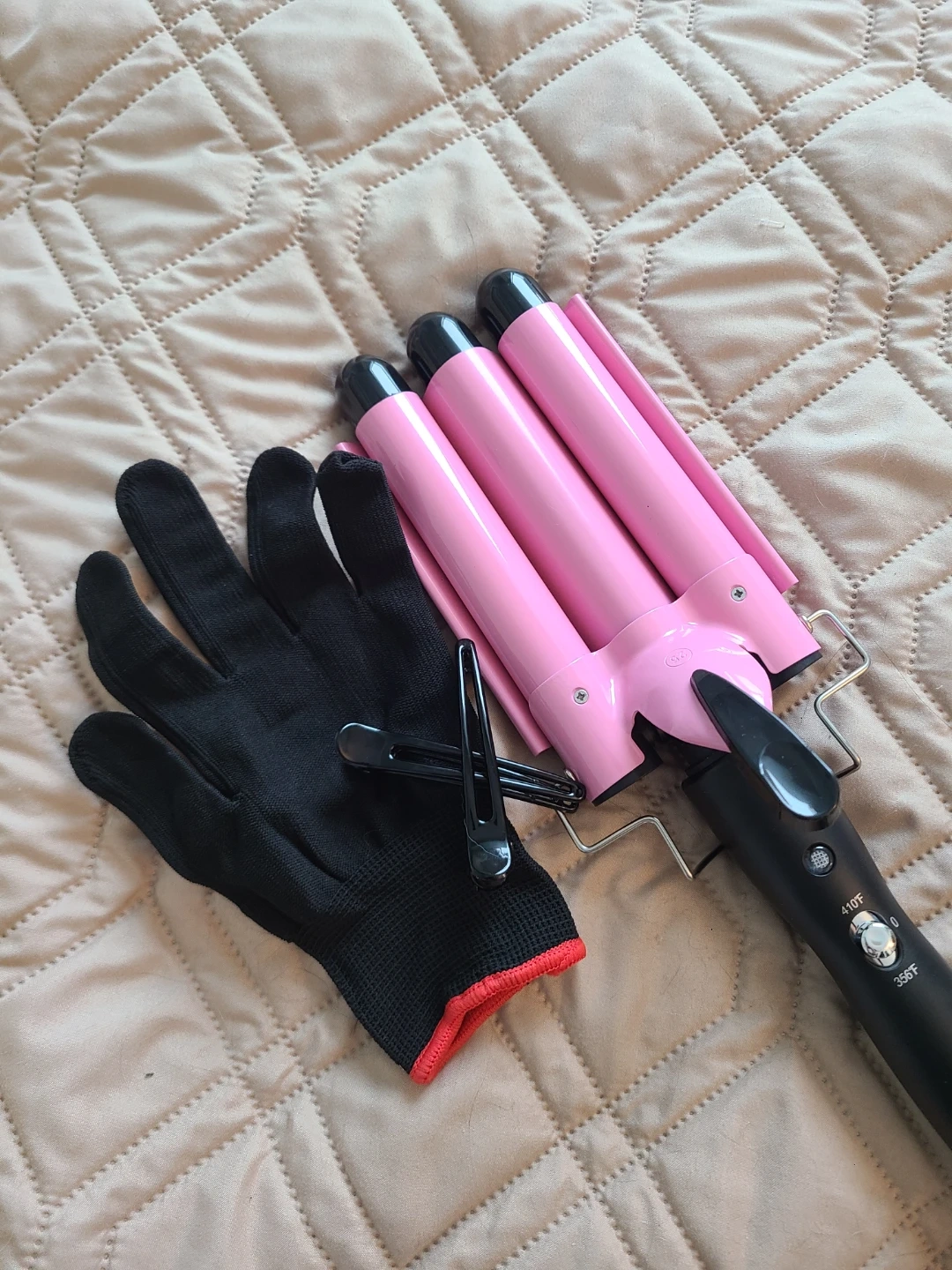Pink 25mm triple barrel curling iron from Top4Ever. It offers two heat settings, 356°F and 410°F. Included are a heat-resistant glove and two hair clips for styling ease. Only used once, great condition.