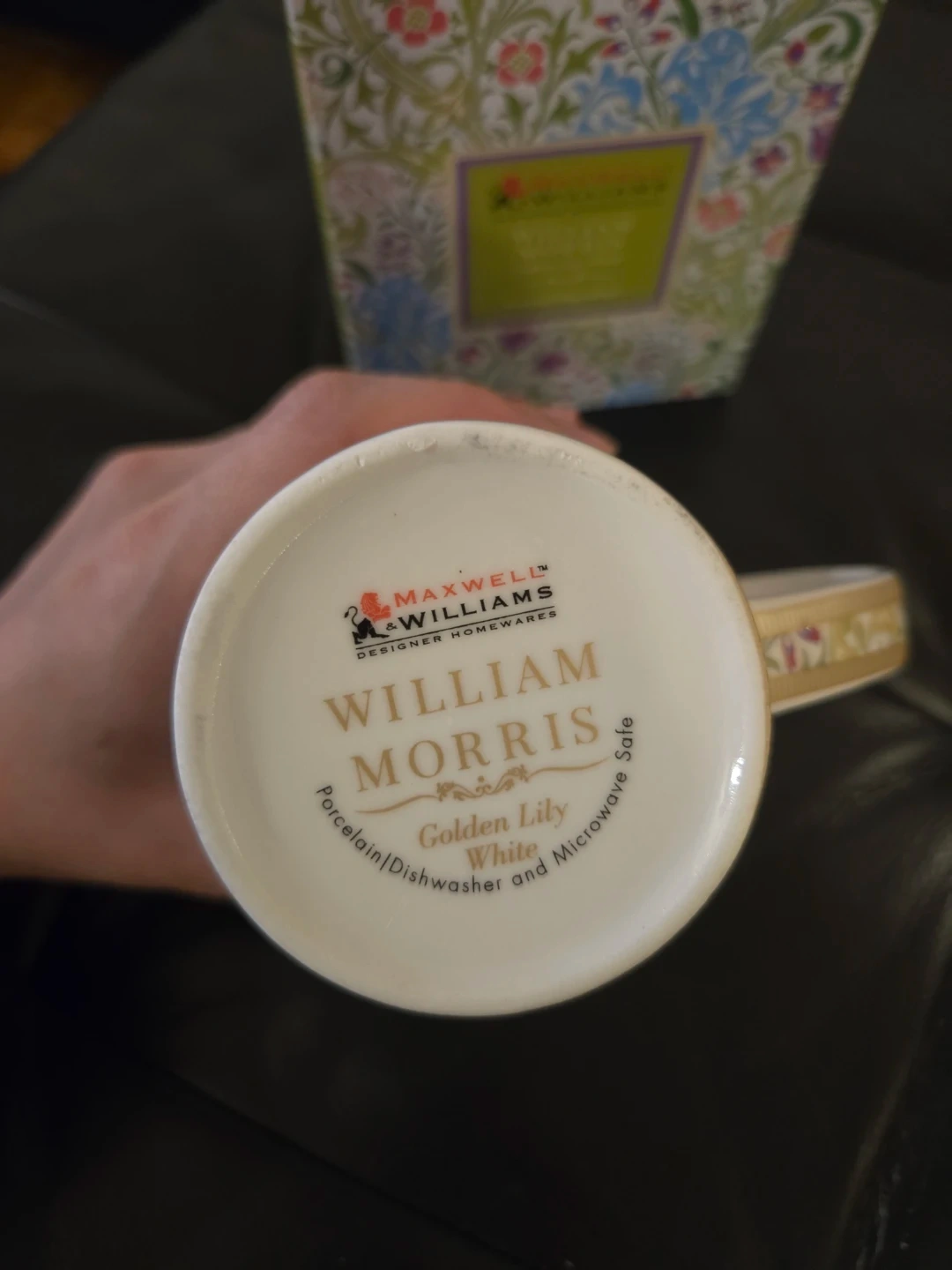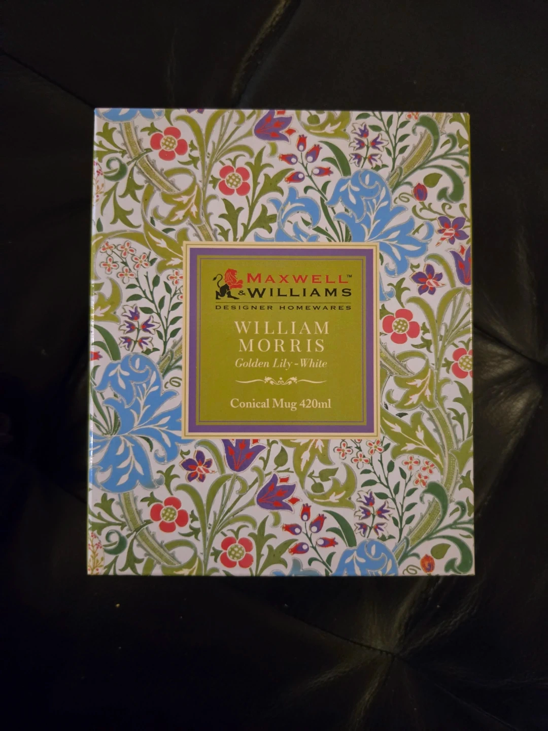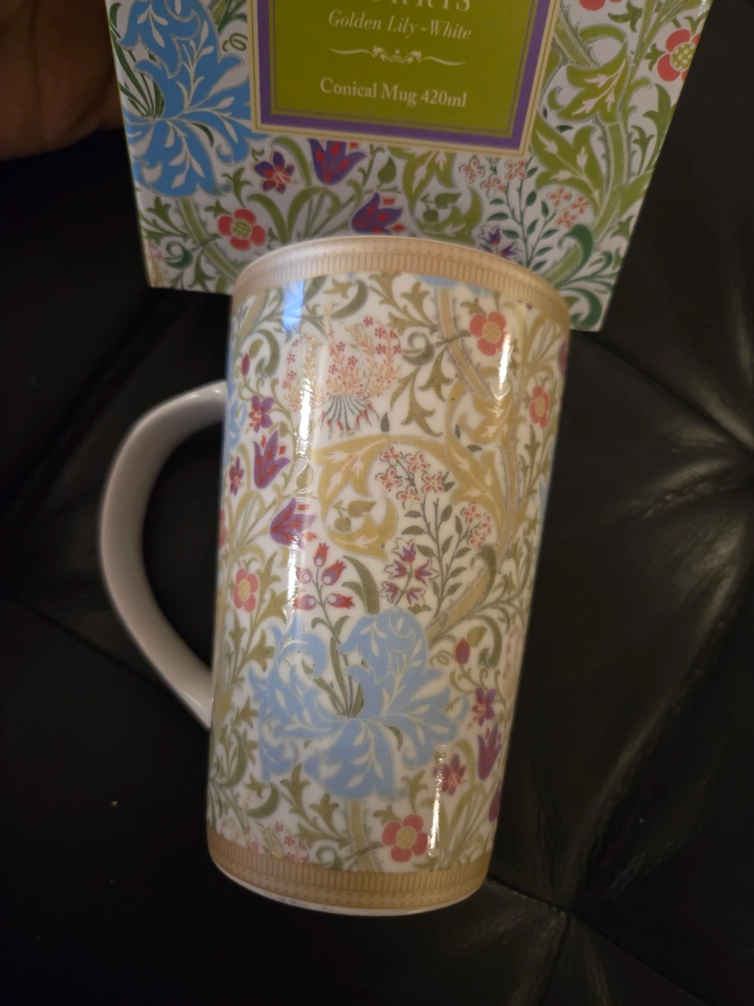 This is a Maxwell & Williams William Morris "Golden Lily - White" conical mug. It's made of porcelain and has a 420ml capacity. It's also dishwasher and microwave safe!