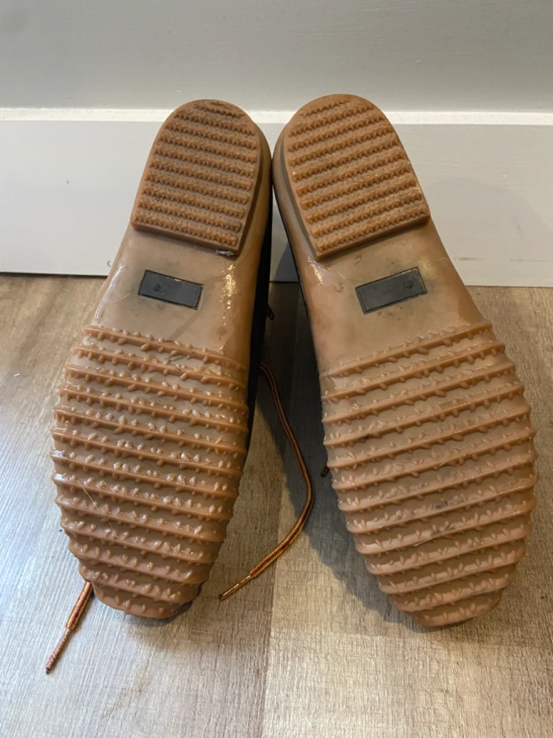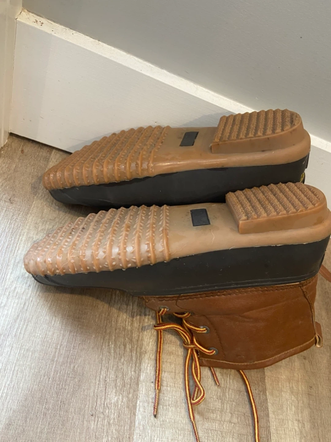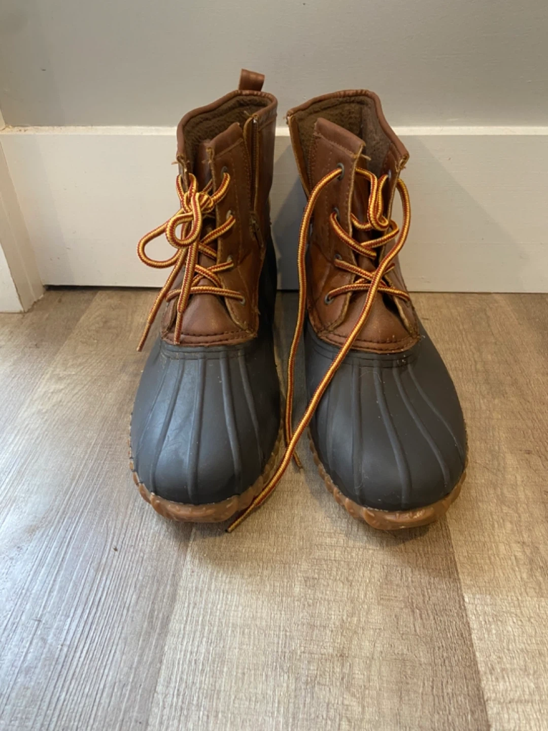Size 10 Esprit women's duck boots in brown. Waterproof rubber lower with leather upper. Features side zippers and lace-up fronts for a secure fit. These boots are great for keeping your feet dry on rainy or snowy days! One pull on tab in back of left pair is broken but otherwise boots in mint condition.