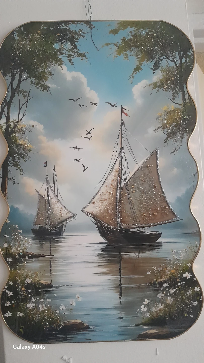A lovely decorative painting of sailboats on the water. It has a unique scalloped edge and a gold-toned trim. Some sparkling embellishments on the sails add a nice touch!