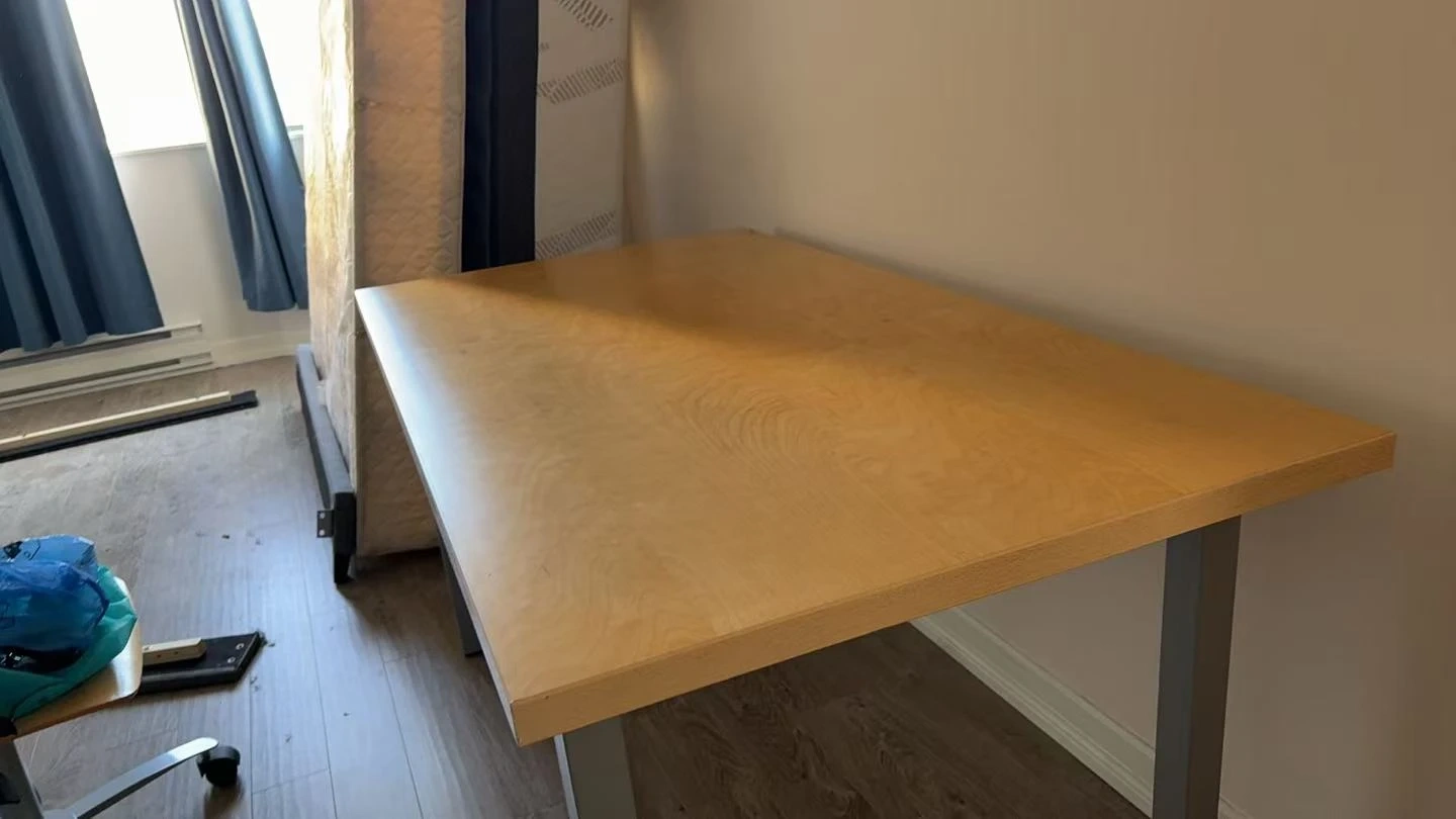 A simple desk with a light wood laminate top and grey metal legs. It's a functional piece for a home office or study area. The surface is smooth and easy to clean. This desk would work well for students or anyone needing a basic workspace.