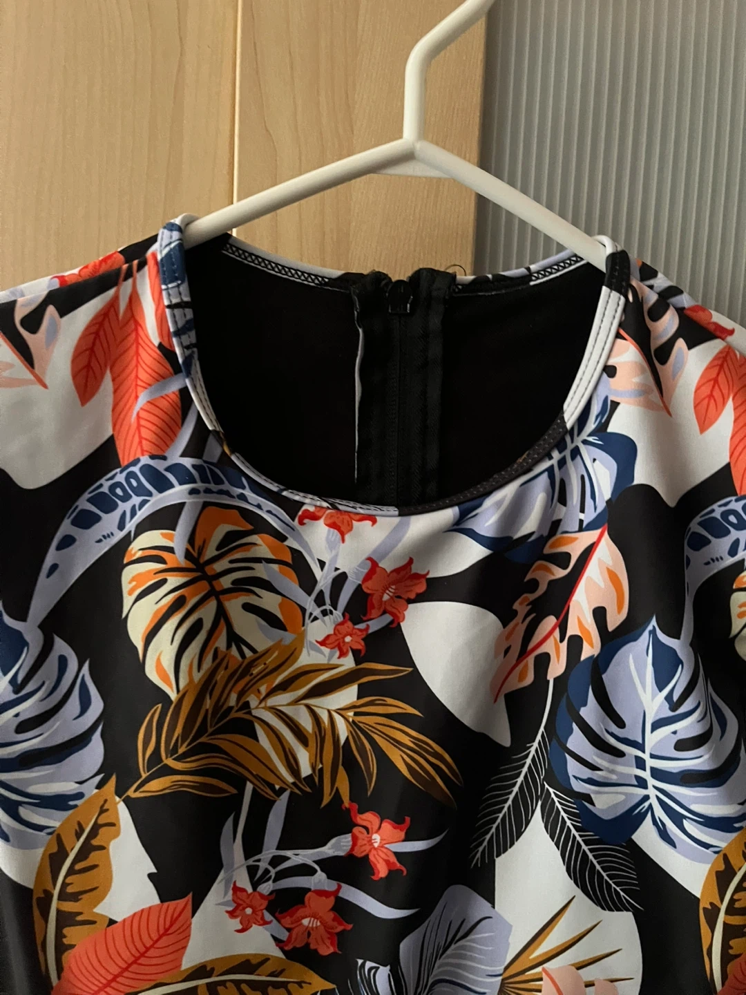 This long-sleeve one-piece swimsuit features a vibrant tropical leaf and floral print. It has a zippered back and cut out detailing on the sides. It's perfect for swimming or any water activity!