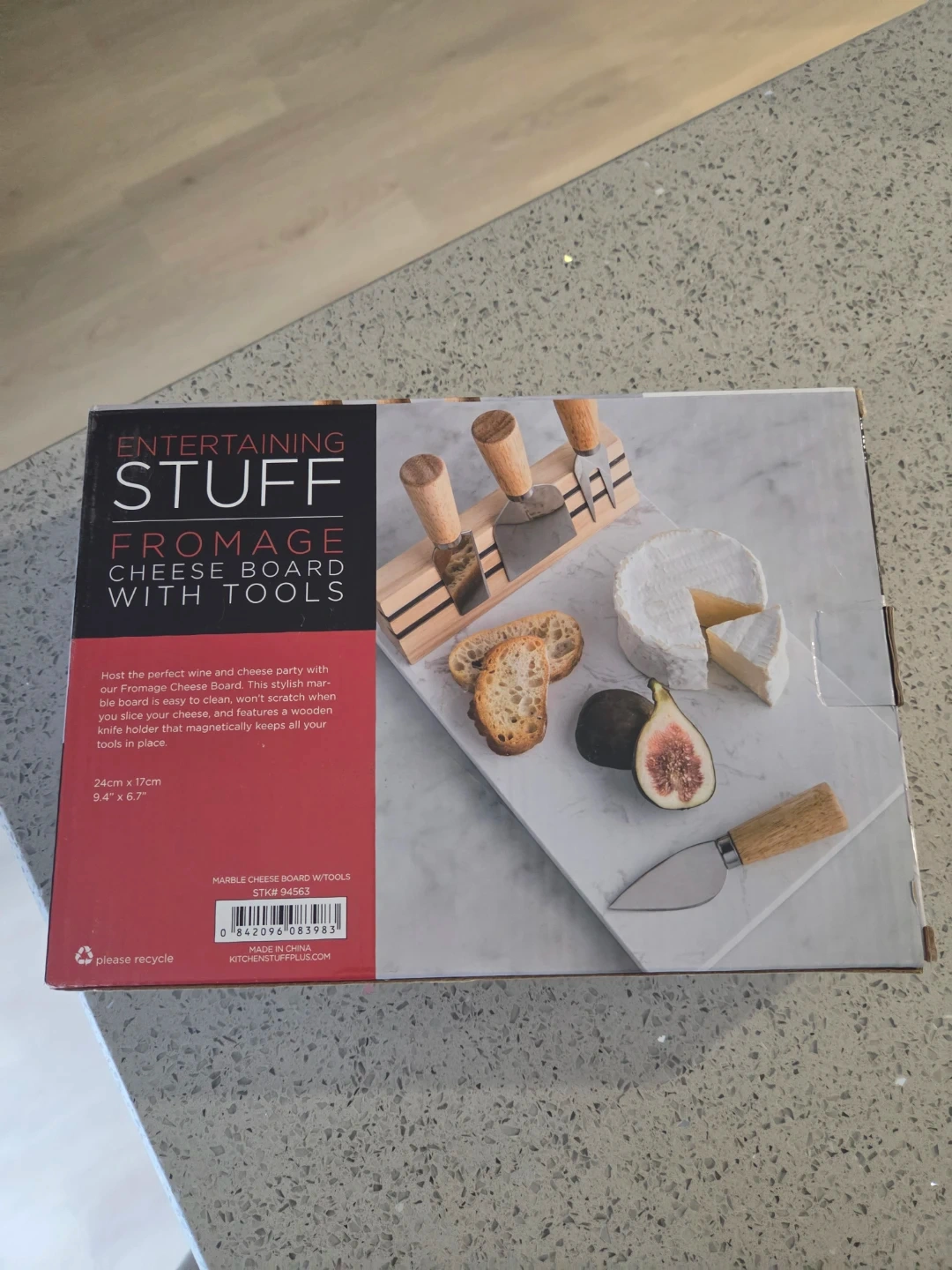 This stylish marble cheese board is easy to clean and won't scratch. It comes with a wooden knife holder that magnetically keeps all your tools in place. Brand new.