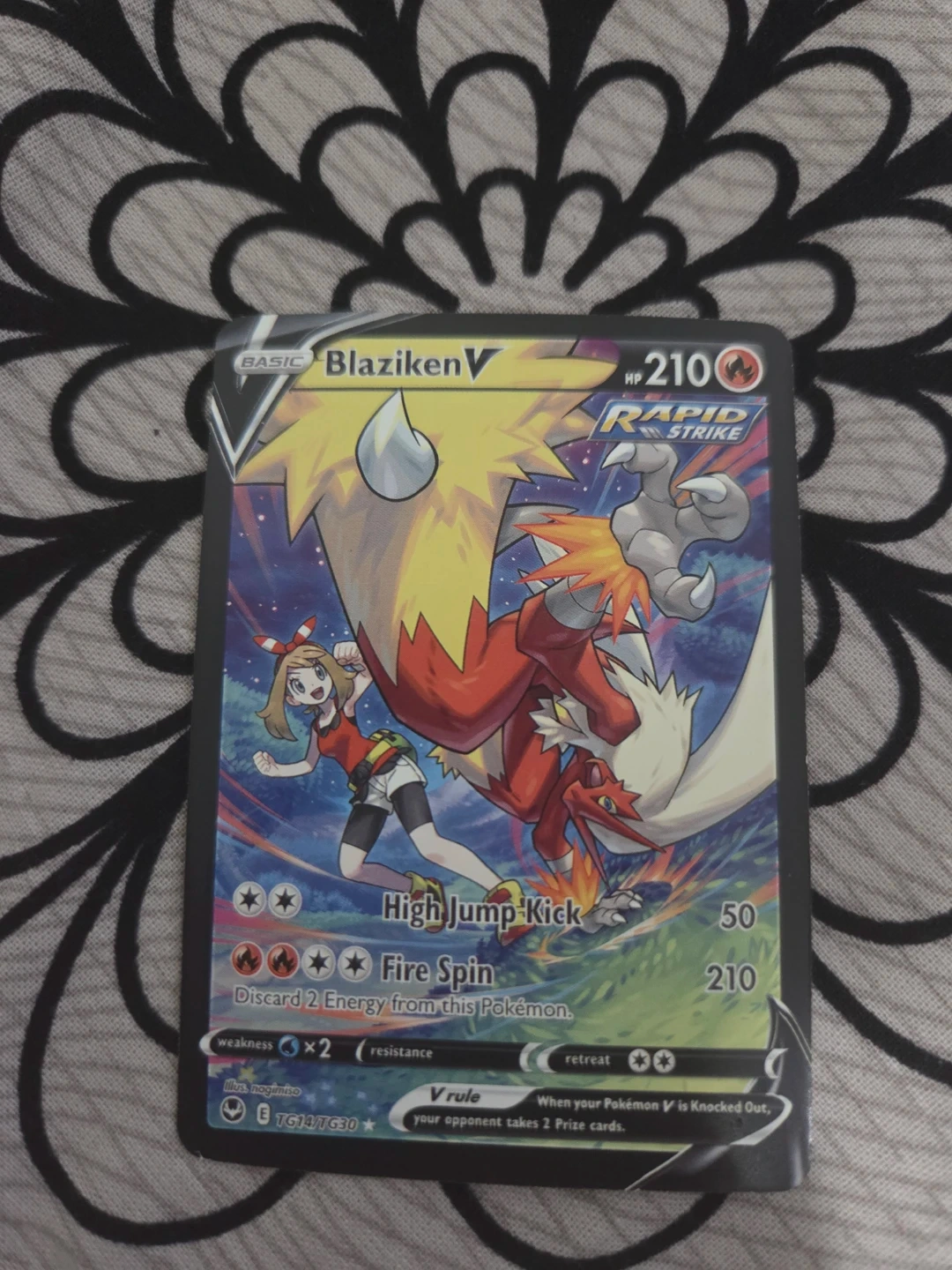 This is a Blaziken V Rapid Strike card from the Pokemon Trading Card Game. It has 210 HP and the 'Fire Spin' attack. V rule applies when this Pokémon is Knocked Out.