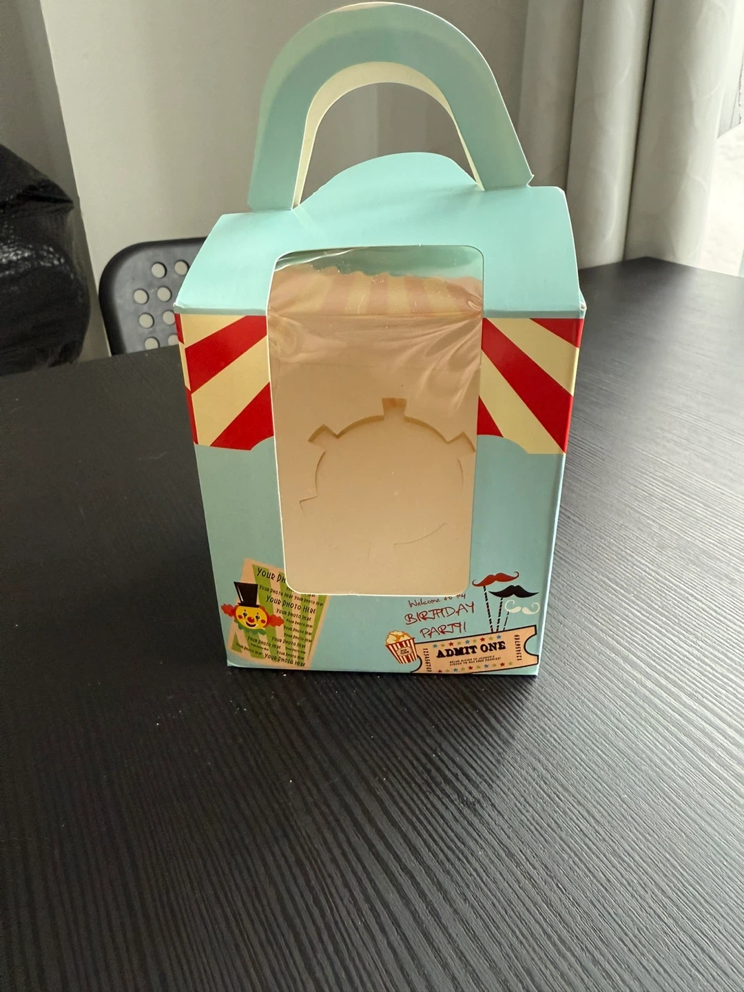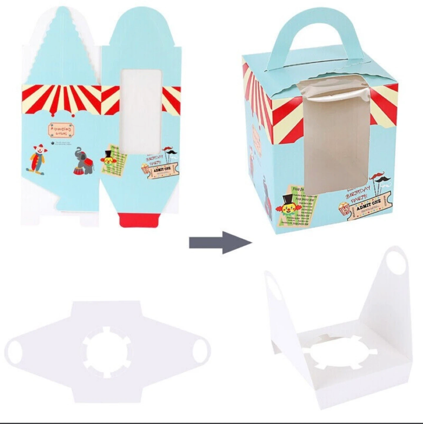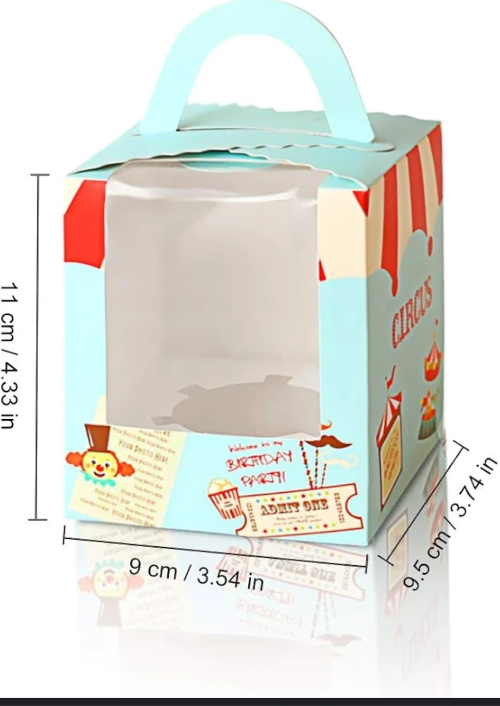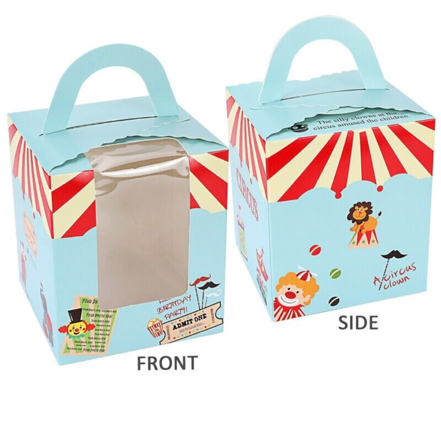 These adorable circus-themed treat boxes are perfect for birthday parties! They feature a fun clown and circus tent design with a clear window. Box dimensions are approximately 9cm x 9.5cm x 11cm.