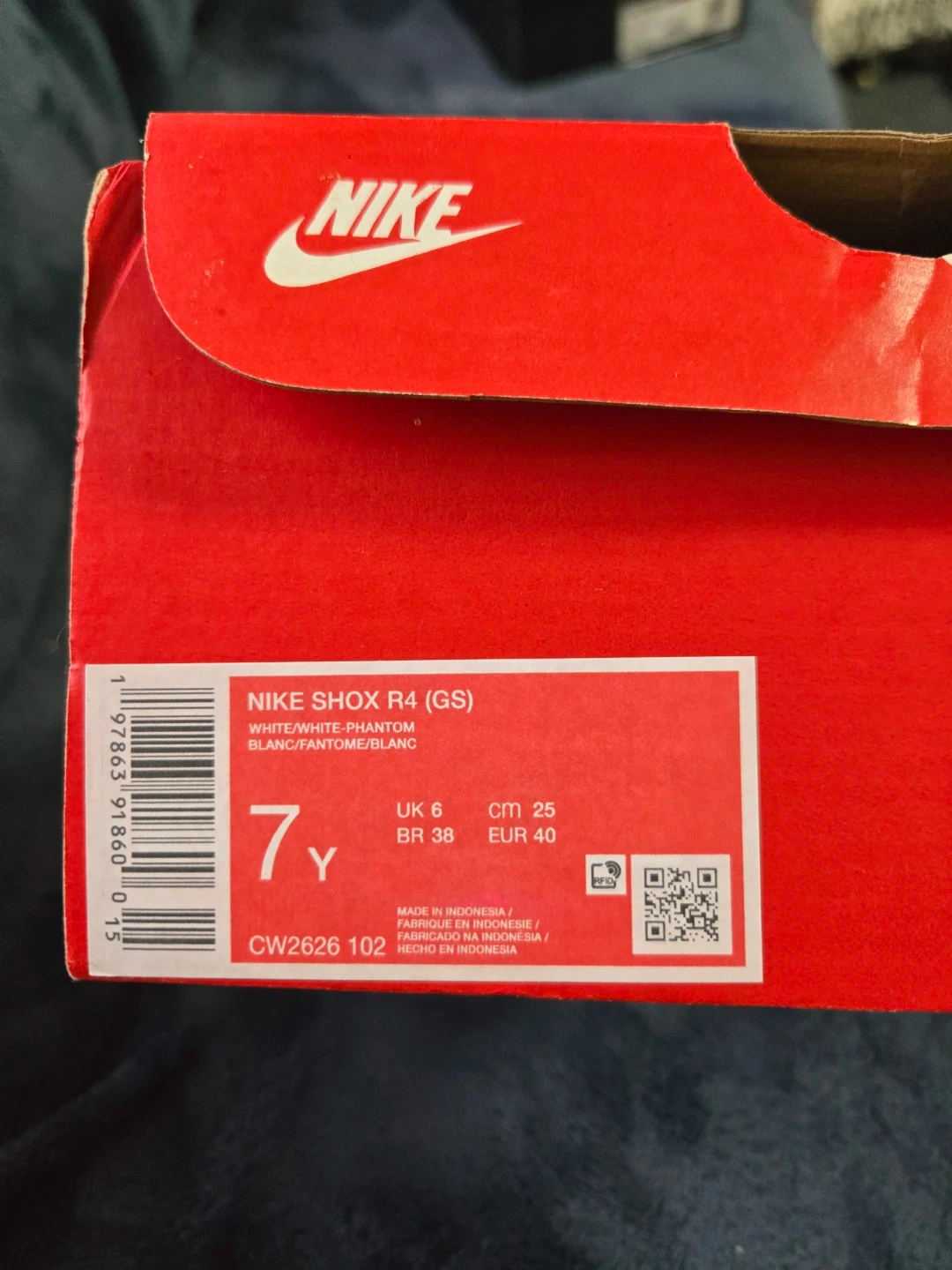 Nike Shox R4 GS youth sneakers in white and phantom. These shoes feature the iconic Shox cushioning system. US Youth size 7Y (UK 6, EUR 40, CM 25). Original price $139