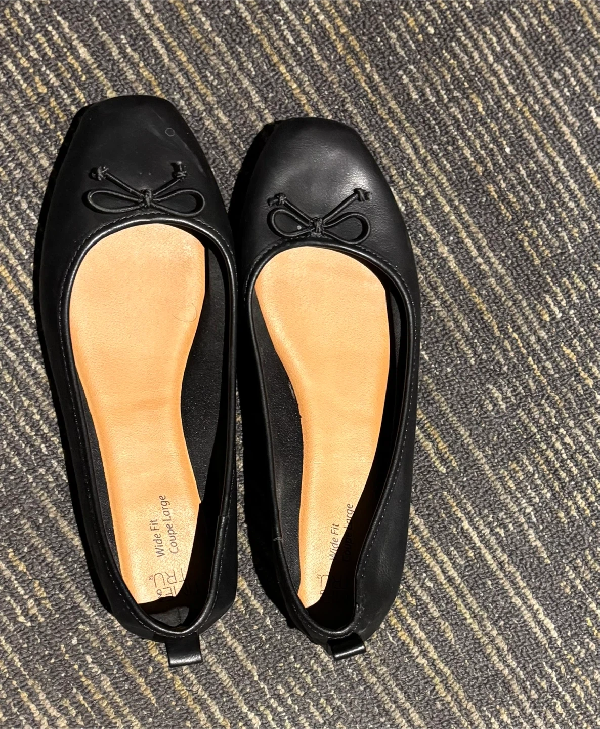 Comfortable black ballet flats with a bow detail. Features a wide fit for extra comfort. Leather material.
