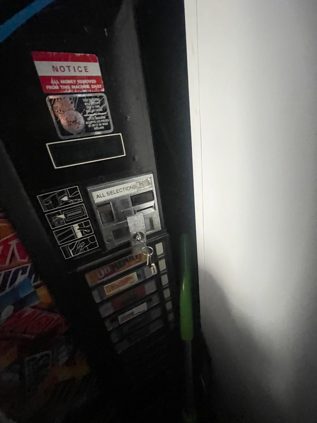 This is a snack vending machine branded with Mars, Snickers, and M&M's. It features selections for various candy bars. It's a great option for stocking a break room or a small business! Only takes coins
