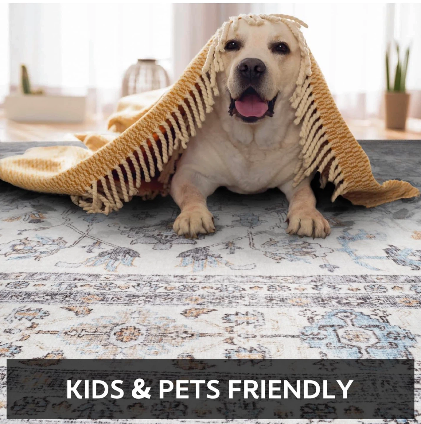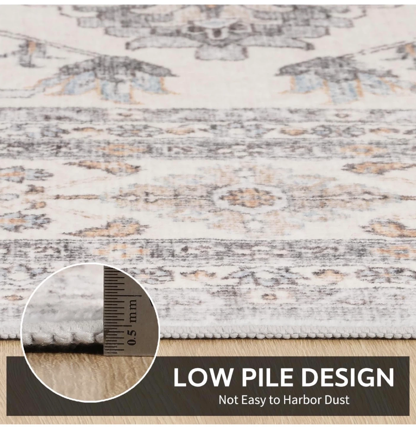 This machine washable rug features a unique pattern design with a non-slip backing. It's kids and pets friendly for daily clean vacuums. Great for any room!