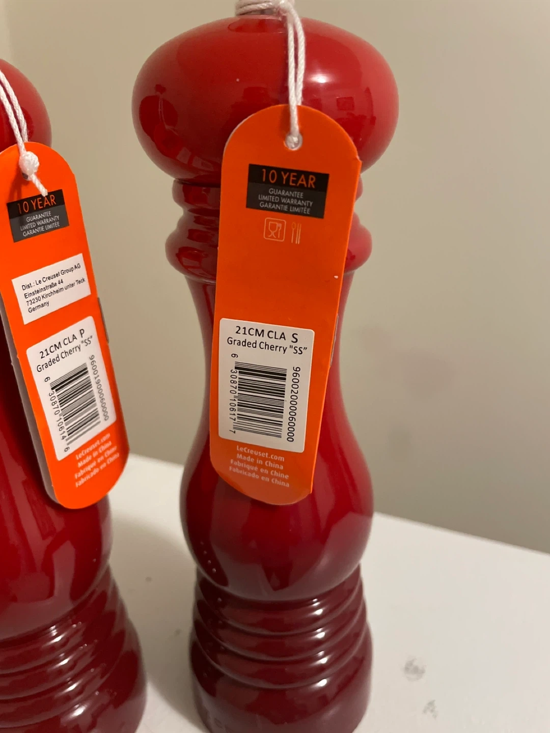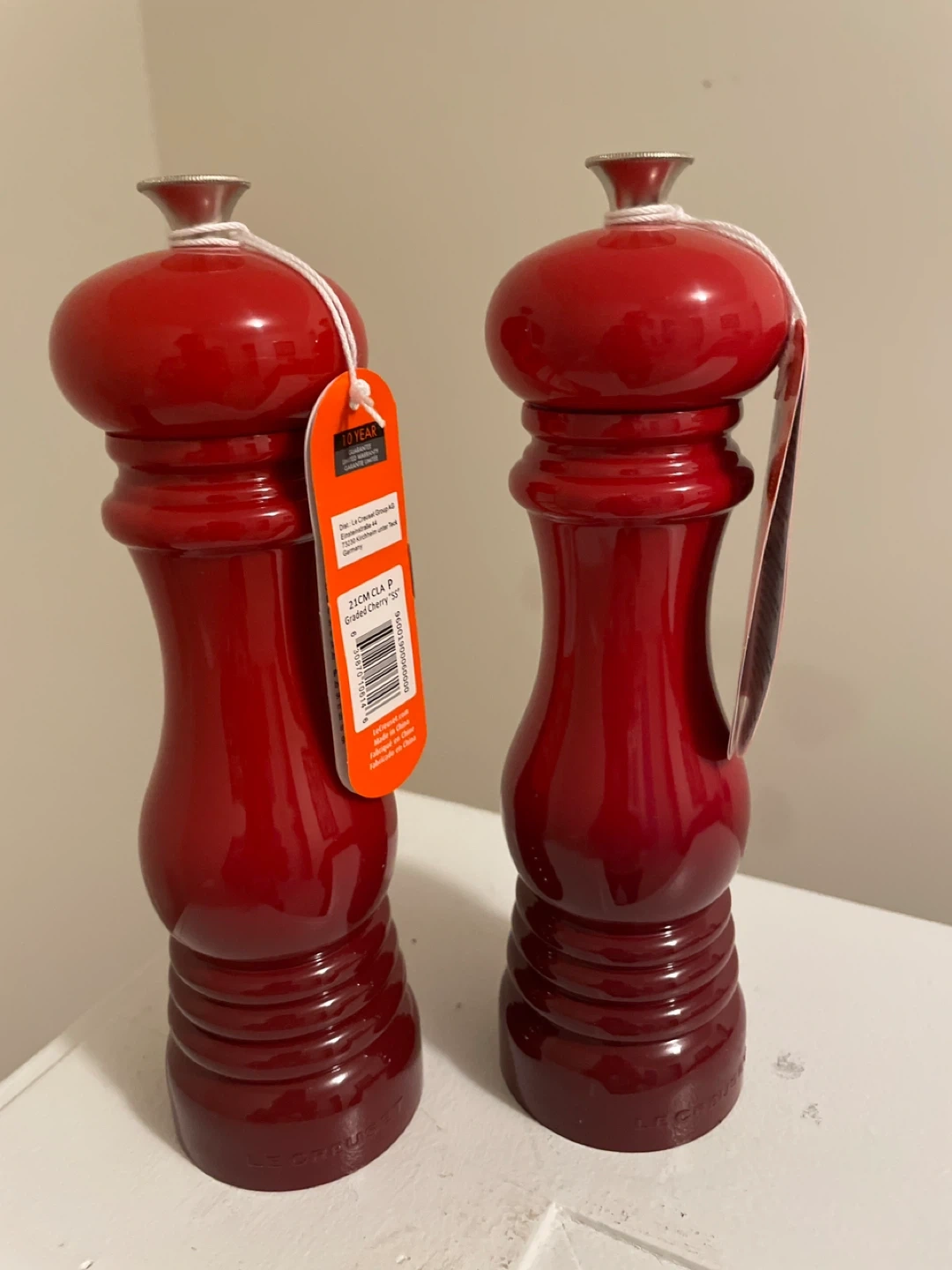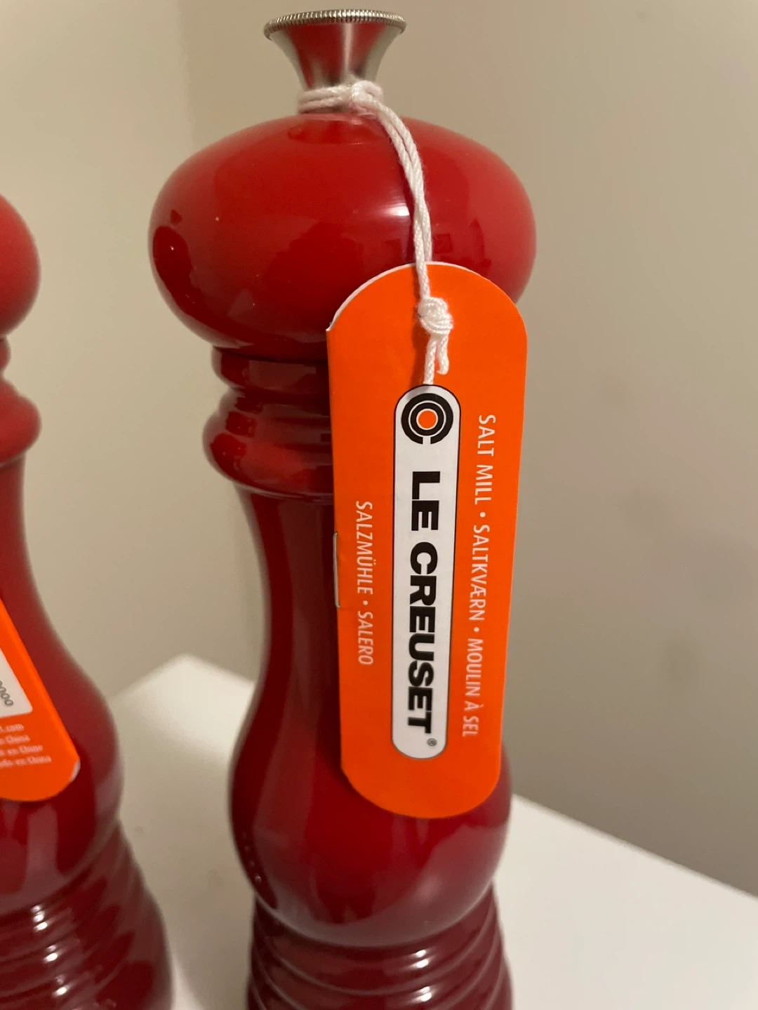 Set of two Le Creuset salt and pepper mills in bright red. These are the 21cm Classique model. They come with original tags and a 10-year warranty. Made in China. Brand new.