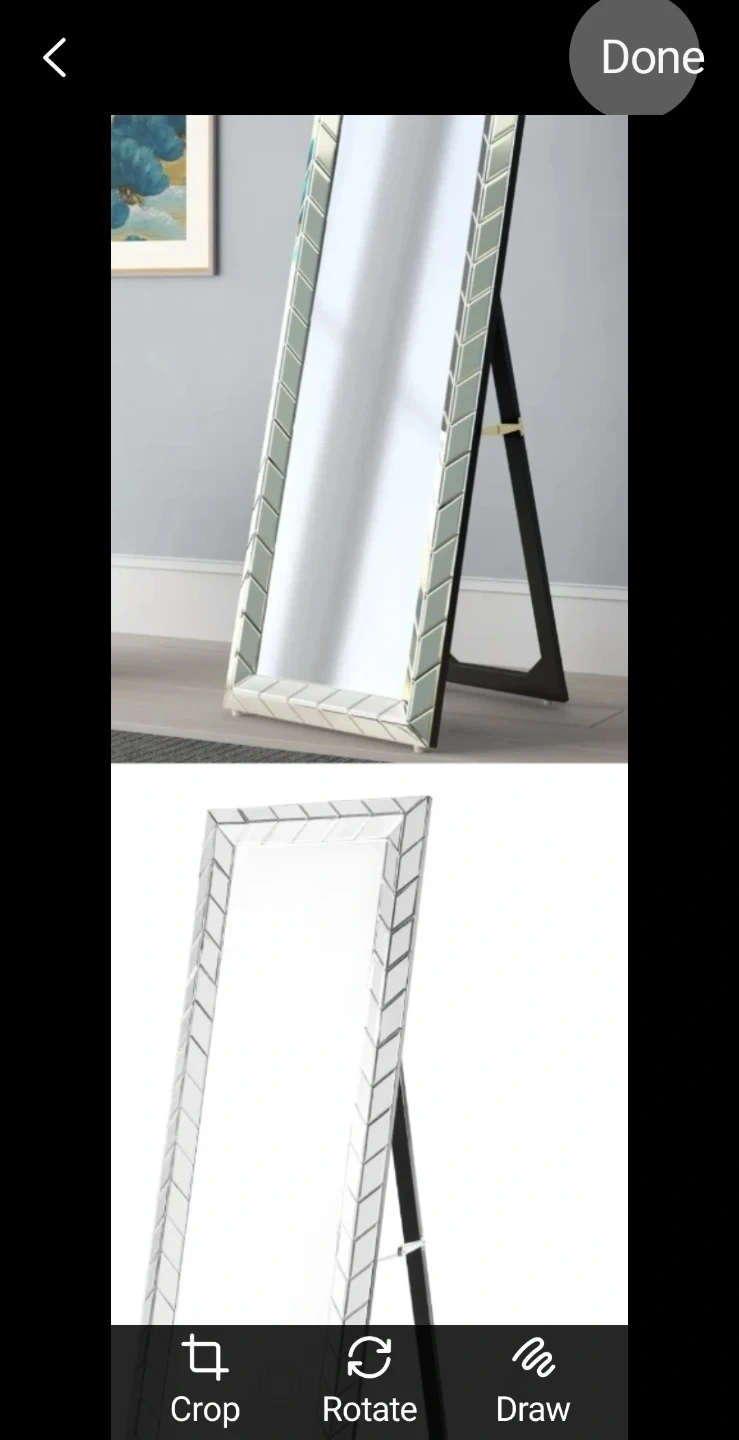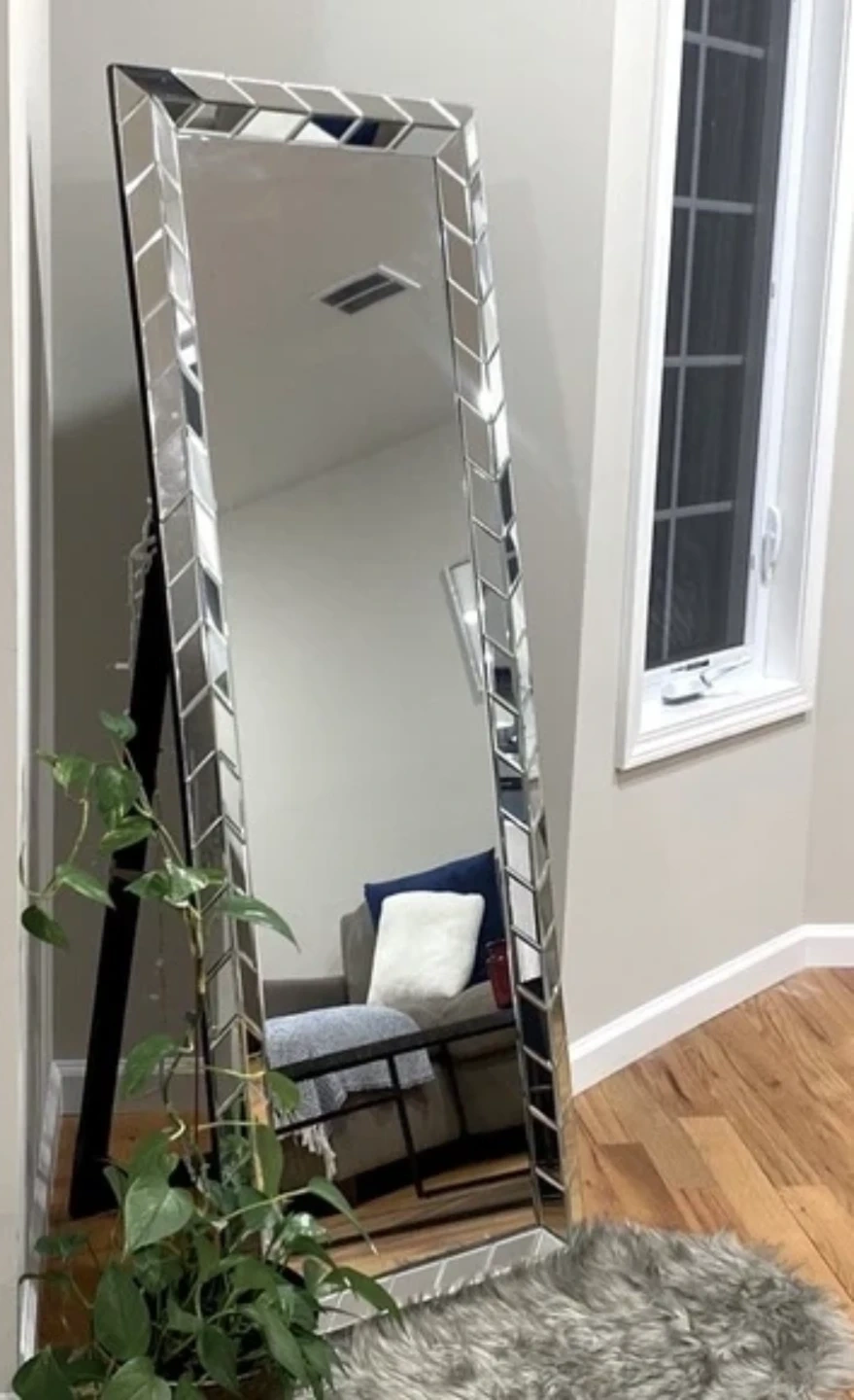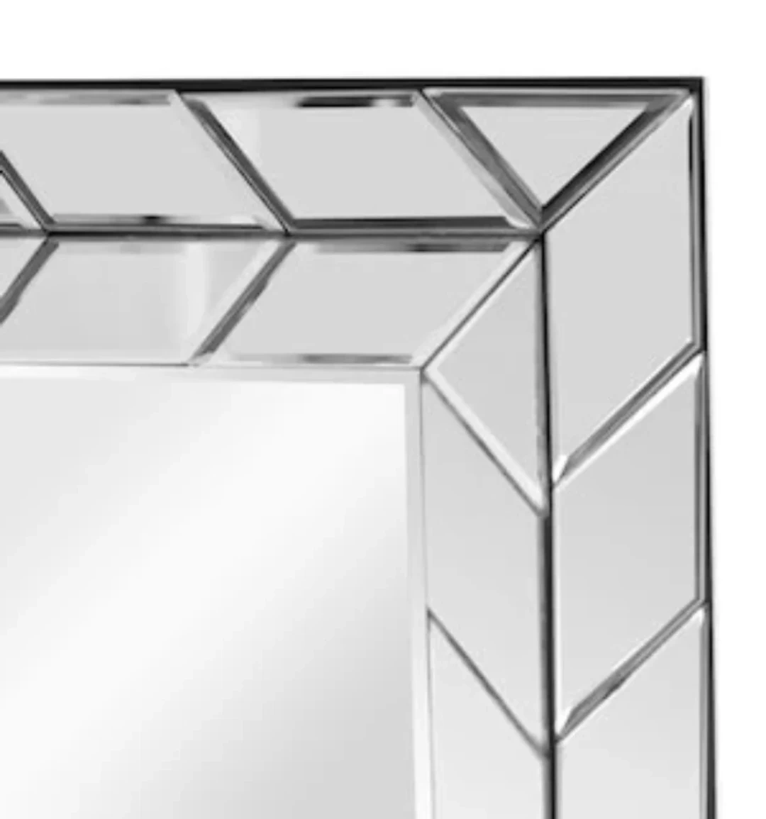 This full-length standing mirror features a unique chevron pattern mirrored frame. It's a stylish addition to any room. The mirror's frame is made of glass.