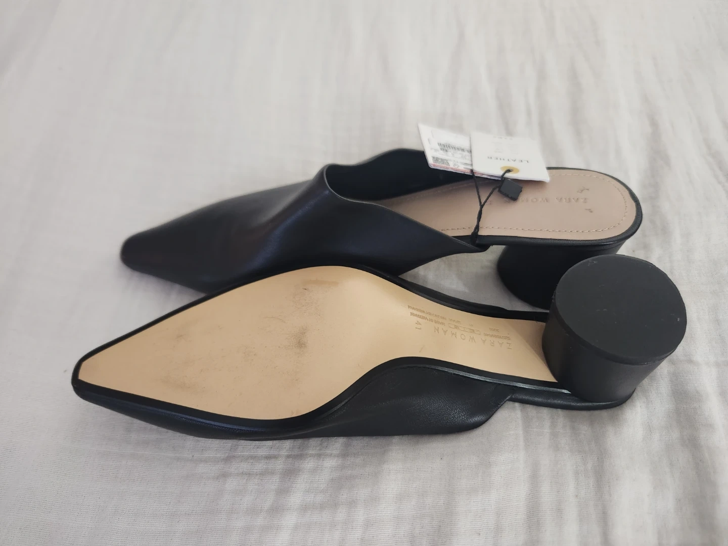 Zara Woman mules in black leather. These slip-on heels feature a pointed toe and a chunky block heel. Perfect for a stylish everyday look. Genuine leather upper.