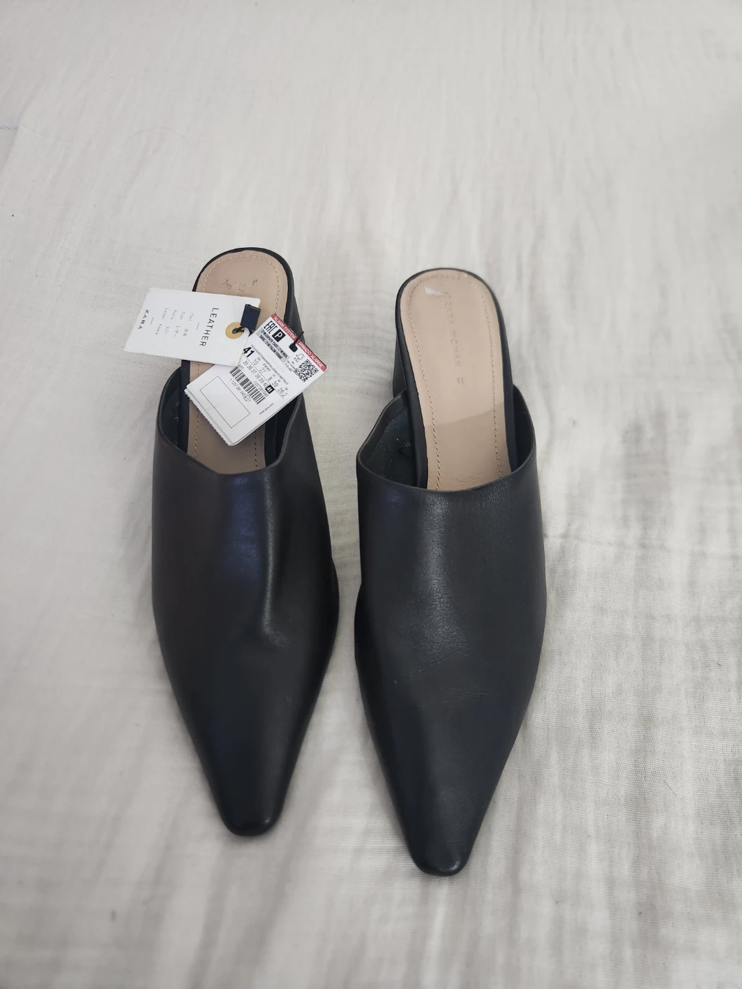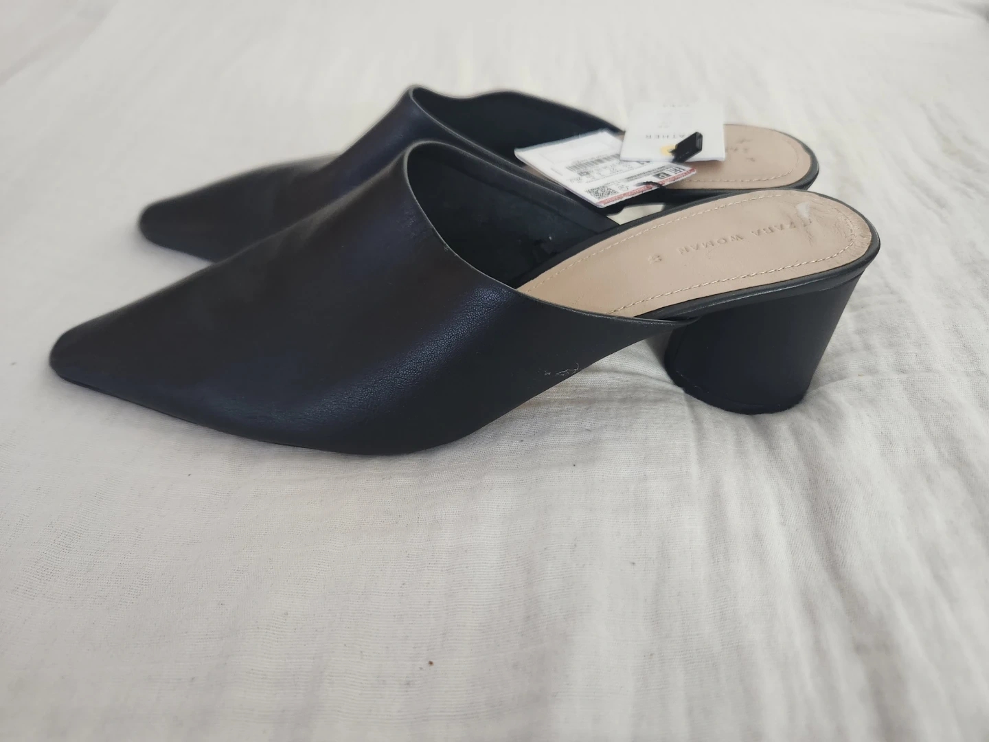 Zara Woman mules in black leather. These slip-on heels feature a pointed toe and a chunky block heel. Perfect for a stylish everyday look. Genuine leather upper.