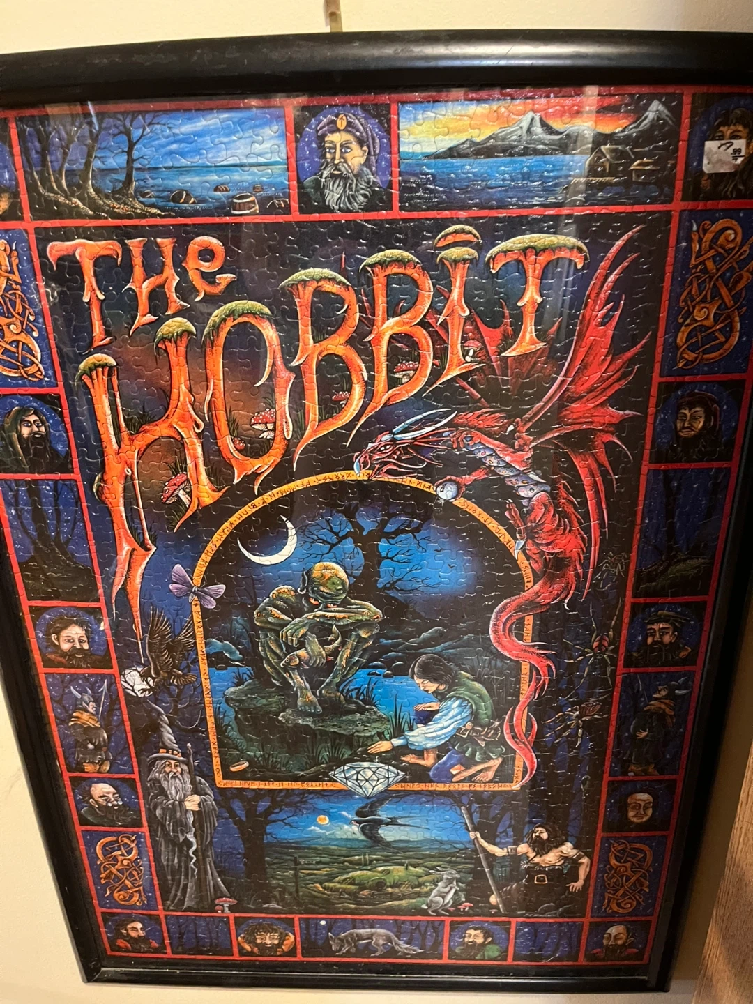 This is a framed puzzle featuring artwork from The Hobbit. It depicts a scene with the dragon Smaug and characters from the story. A great piece for any fan! ❤️