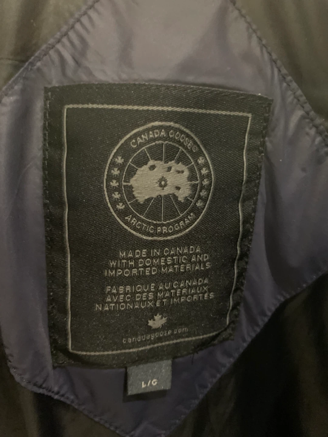 Canada Goose navy blue puffer jacket. Size L/G. Made in Canada with domestic and imported materials. It's a warm, insulated coat perfect for cold weather.