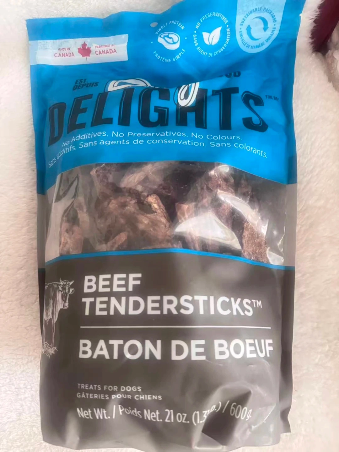 Delights Beef Tendersticks dog treats are made with simple protein. No additives, no preservatives, no colours. Net weight is 21 oz. (600g).
