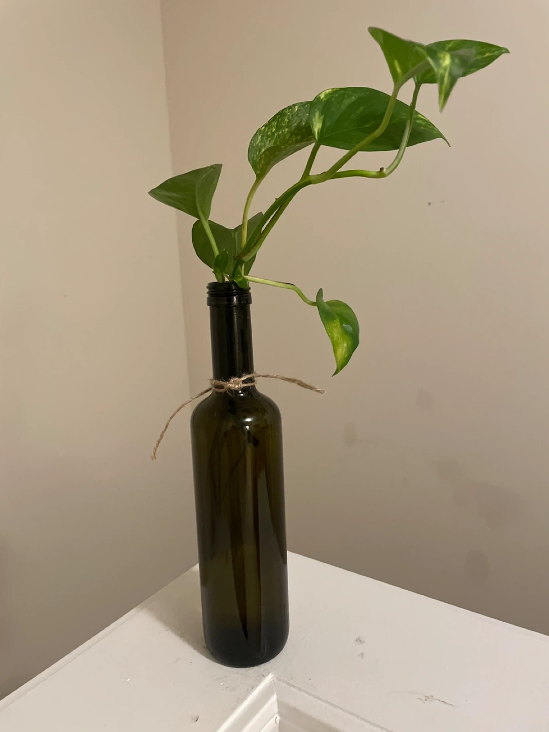 A Pothos plant cutting rooted in a dark green glass bottle. Twine accents the bottle neck. Easy to care for and grows quickly!
