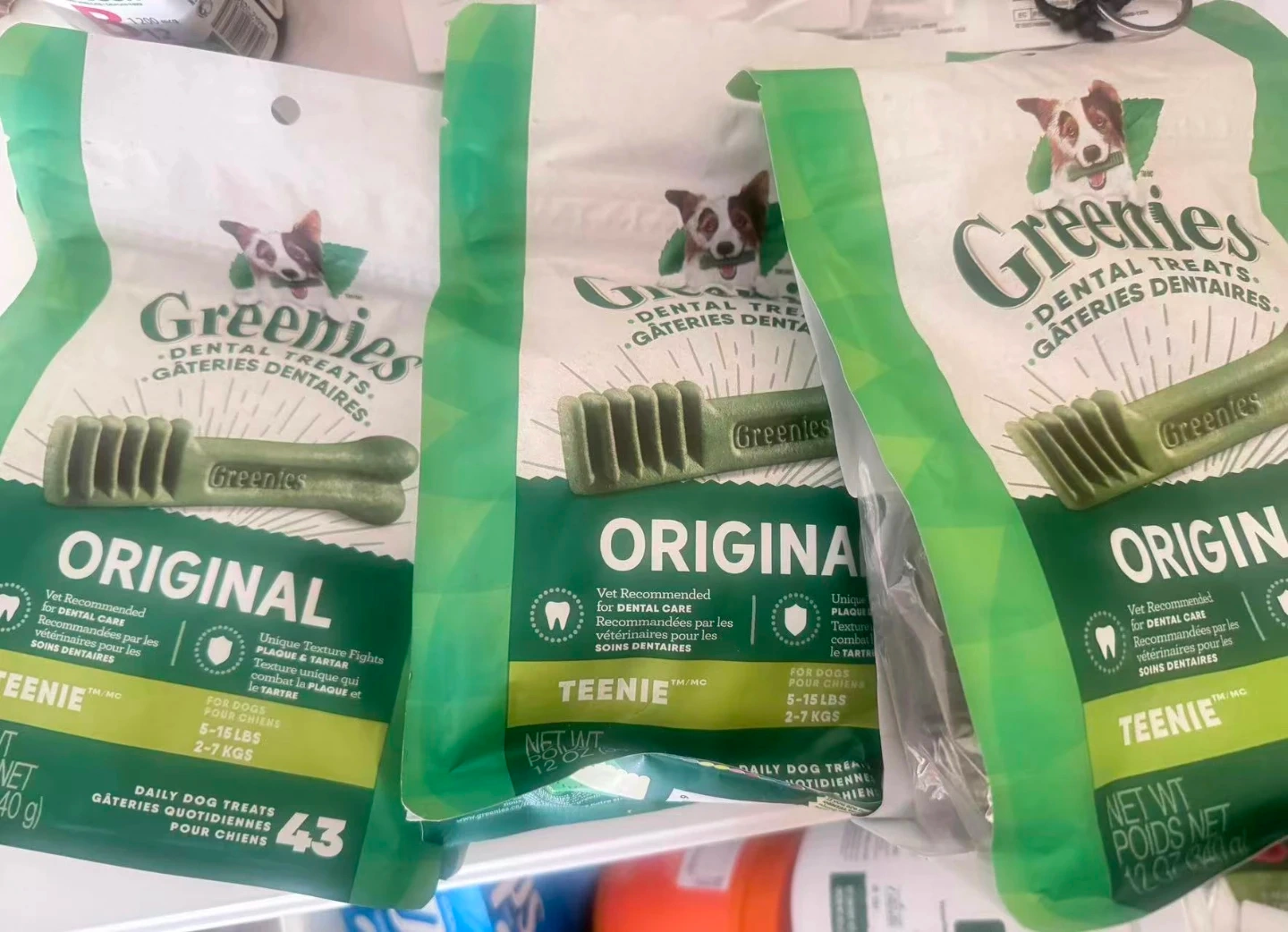 These Greenies Original Teenie dental treats are vet recommended for dental care. They have a unique texture that fights plaque and tartar. For dogs 5-15 lbs. 3 bags.