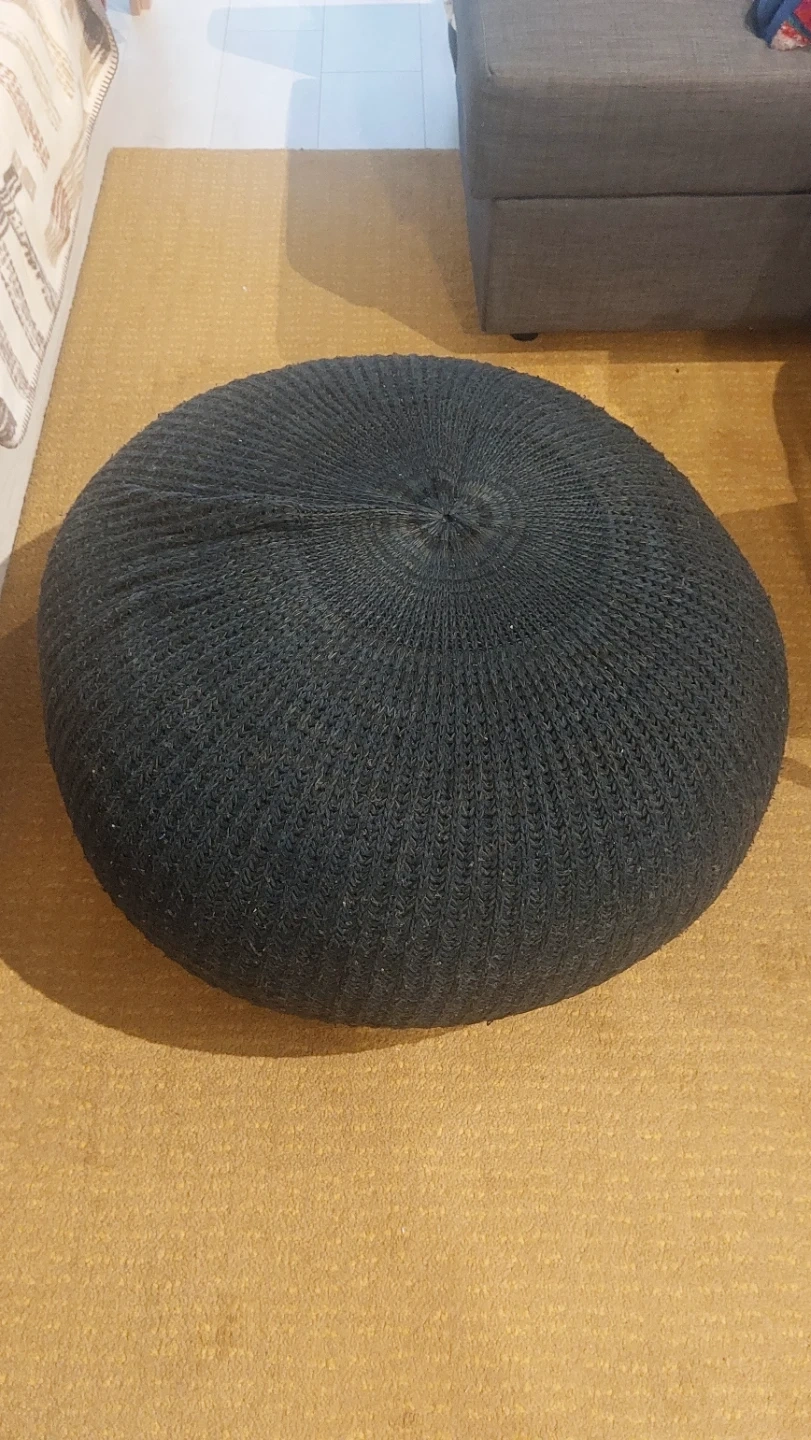 Round knitted pouf ottoman in a dark blue colour. It's great for extra seating or as a footrest. Fabric is a textured knit and can be removed and washed. The size is about diameter of 70cm.