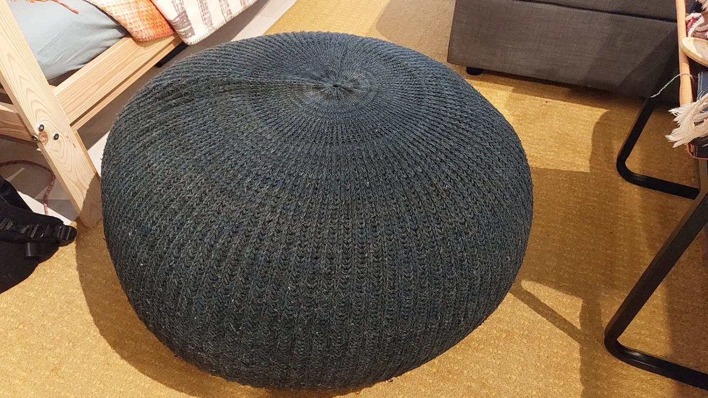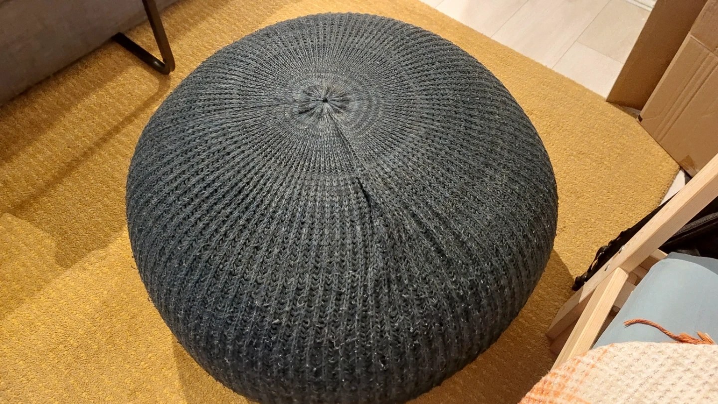 Round knitted pouf ottoman in a dark blue colour. It's great for extra seating or as a footrest. Fabric is a textured knit and can be removed and washed. The size is about diameter of 70cm.