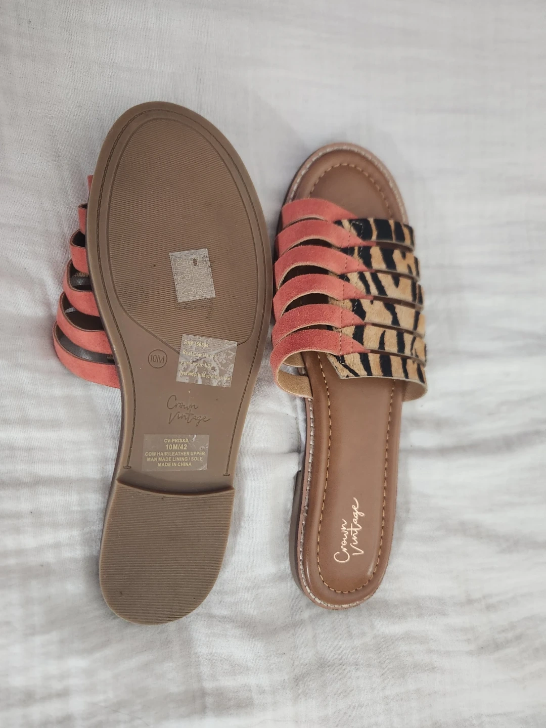 Stylish slide sandals from Crown Vintage with a fun coral and animal print design. These sandals are a size 10M. Perfect for adding a pop of colour to your casual outfits!