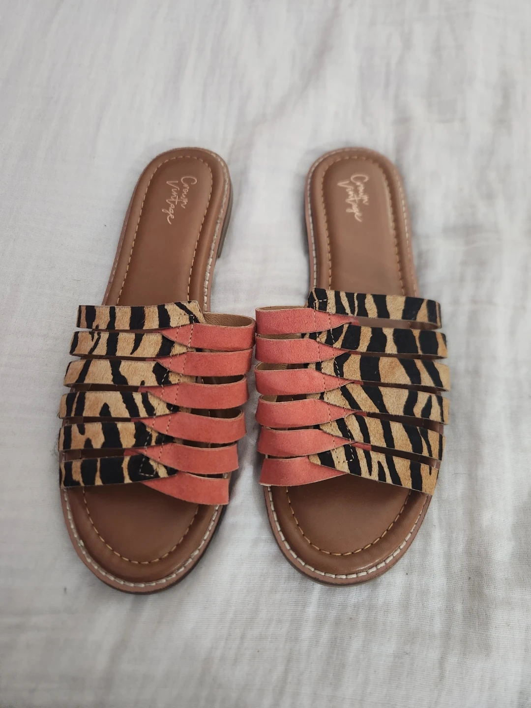 Stylish slide sandals from Crown Vintage with a fun coral and animal print design. These sandals are a size 10M. Perfect for adding a pop of colour to your casual outfits!
