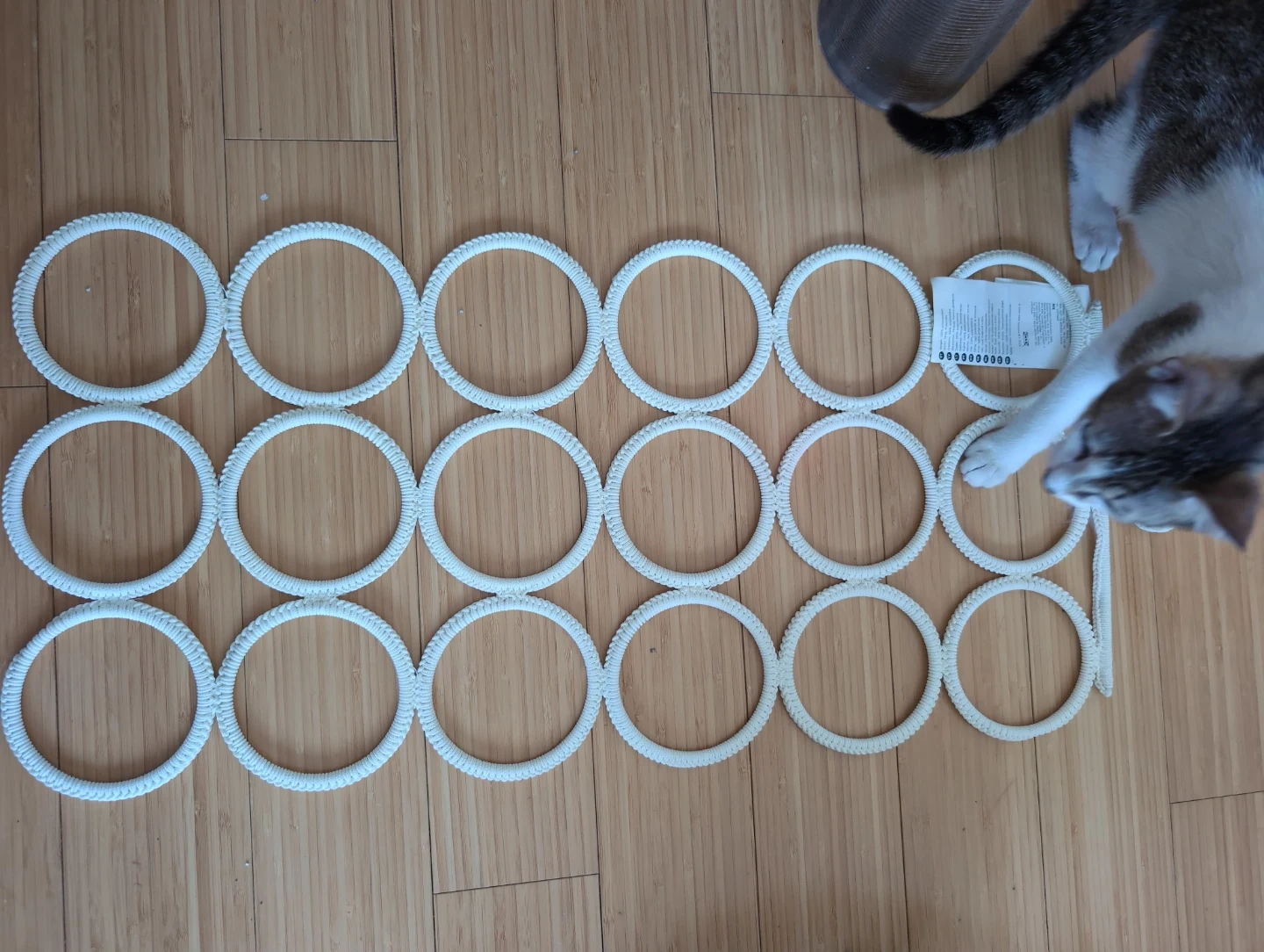 This is a white rope organizer with 15 loops. It's great for storing necklaces or scarves neatly. The rope material is durable and looks tidy in a closet.