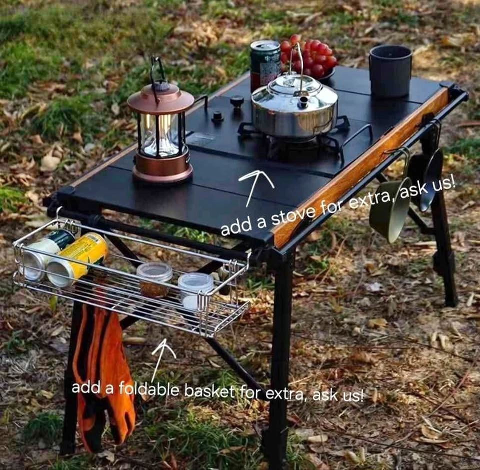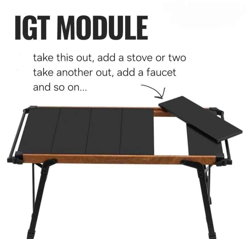 This IGT camping table features modules to create multiple combinations. Use it with our charcoal grill and portable gas stove to meet different cooking needs. The table has an easy folding structure, allowing you to set up in seconds. The packed size is 18x12x55cm, making it compact and easy to transport. It has a convenient hanging rod for tableware or kitchenware and a stove module compatible with our camp stoves and faucet unit. Made of lightweight, weather-resistant 6063 aluminum alloy with superior durability and stability, it weighs only about 8 lbs. Perfect for car camping, tailgating, picnics, barbecues, RV trips, patio, and beach use.
