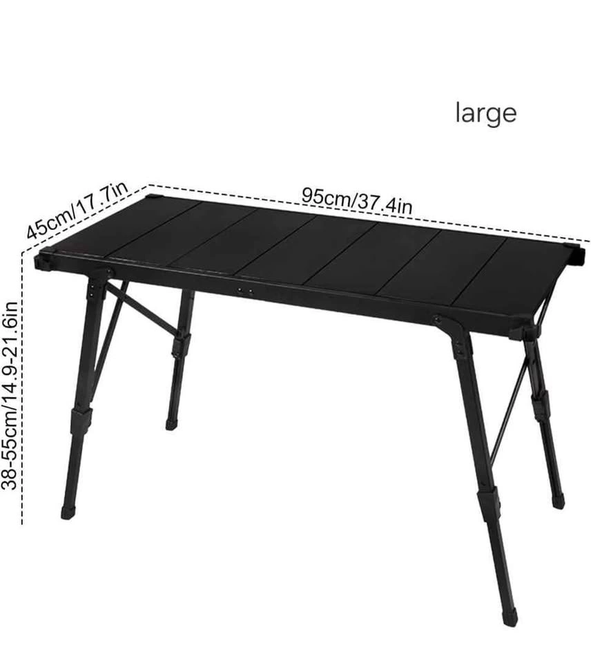 The camping table is adjustable in height with side rails and all stores in a small carry-on bag.