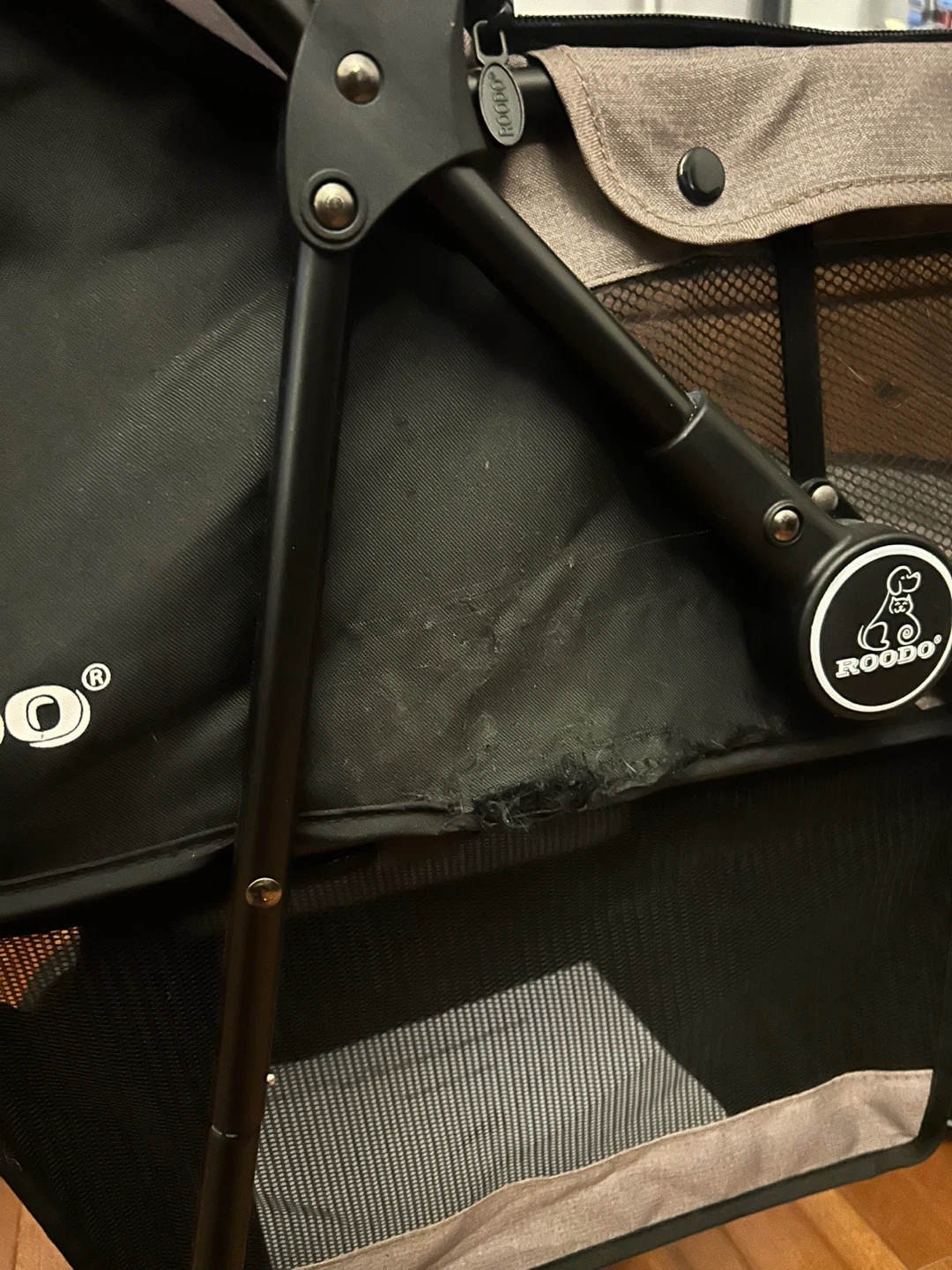 Pet stroller for small dogs or cats. Features a secure harness and mesh windows for ventilation. Plenty of storage pockets on the back. It's easy to maneuver on different surfaces. This stroller's canopy can be adjusted. The wheels and everything work great! There’re small spots with my cat’s scratches that’s why I’m putting this in a low price. Your pet will love this!