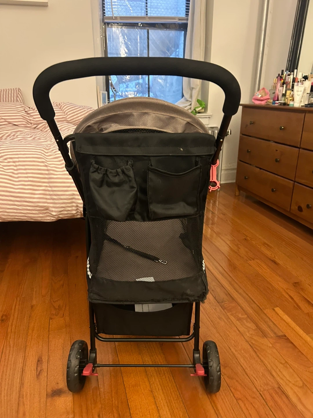 Pet stroller for small dogs or cats. Features a secure harness and mesh windows for ventilation. Plenty of storage pockets on the back. It's easy to maneuver on different surfaces. This stroller's canopy can be adjusted. The wheels and everything work great! There’re small spots with my cat’s scratches that’s why I’m putting this in a low price. Your pet will love this!