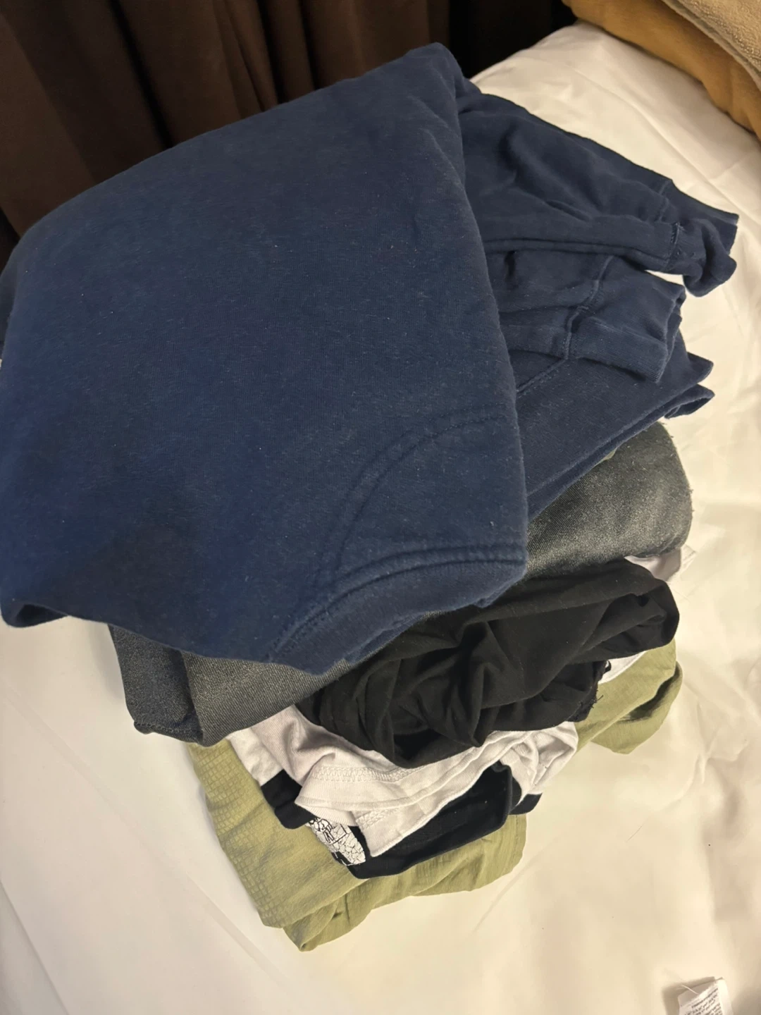 Bundle of men's casual tops in various colours including navy, grey, black, and green. Made from comfortable, breathable materials. Great for everyday wear!