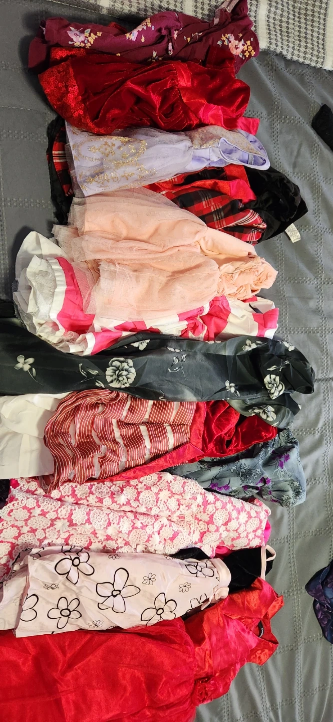 A collection of 12 girls' dresses in various styles and colours. Includes velvet, tulle, and patterned fabrics. Great for parties or special occasions!