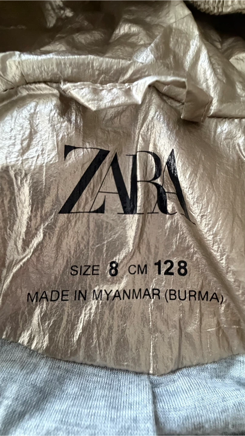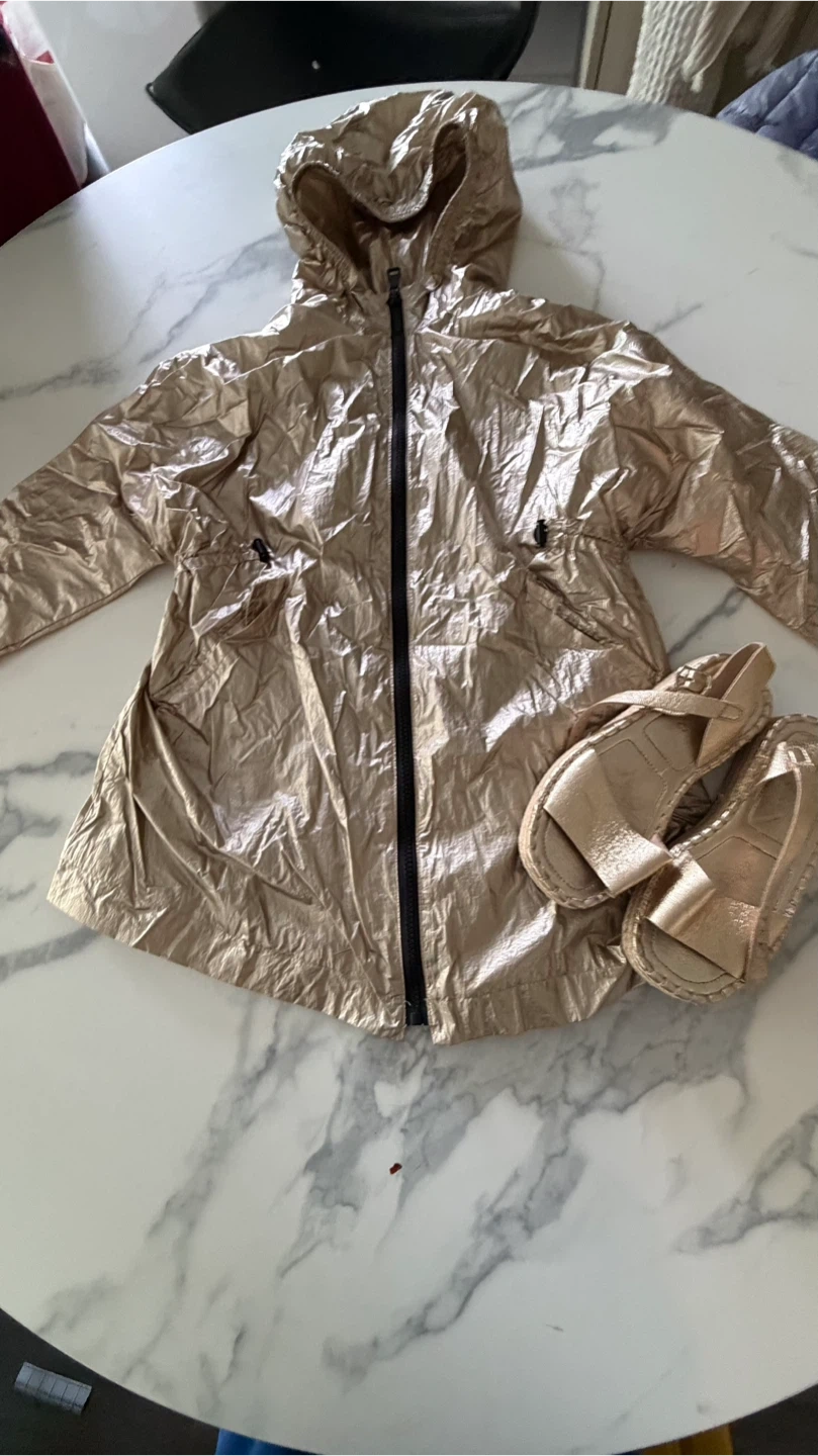 This set includes a Zara gold hooded jacket and matching gold sandals. Jacket size is 8 CM 128. Sandals feature a comfortable strap design.