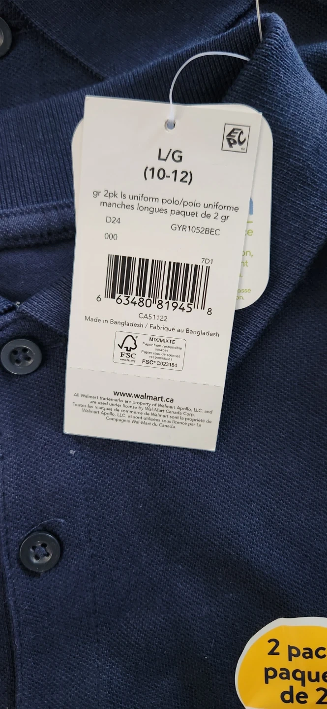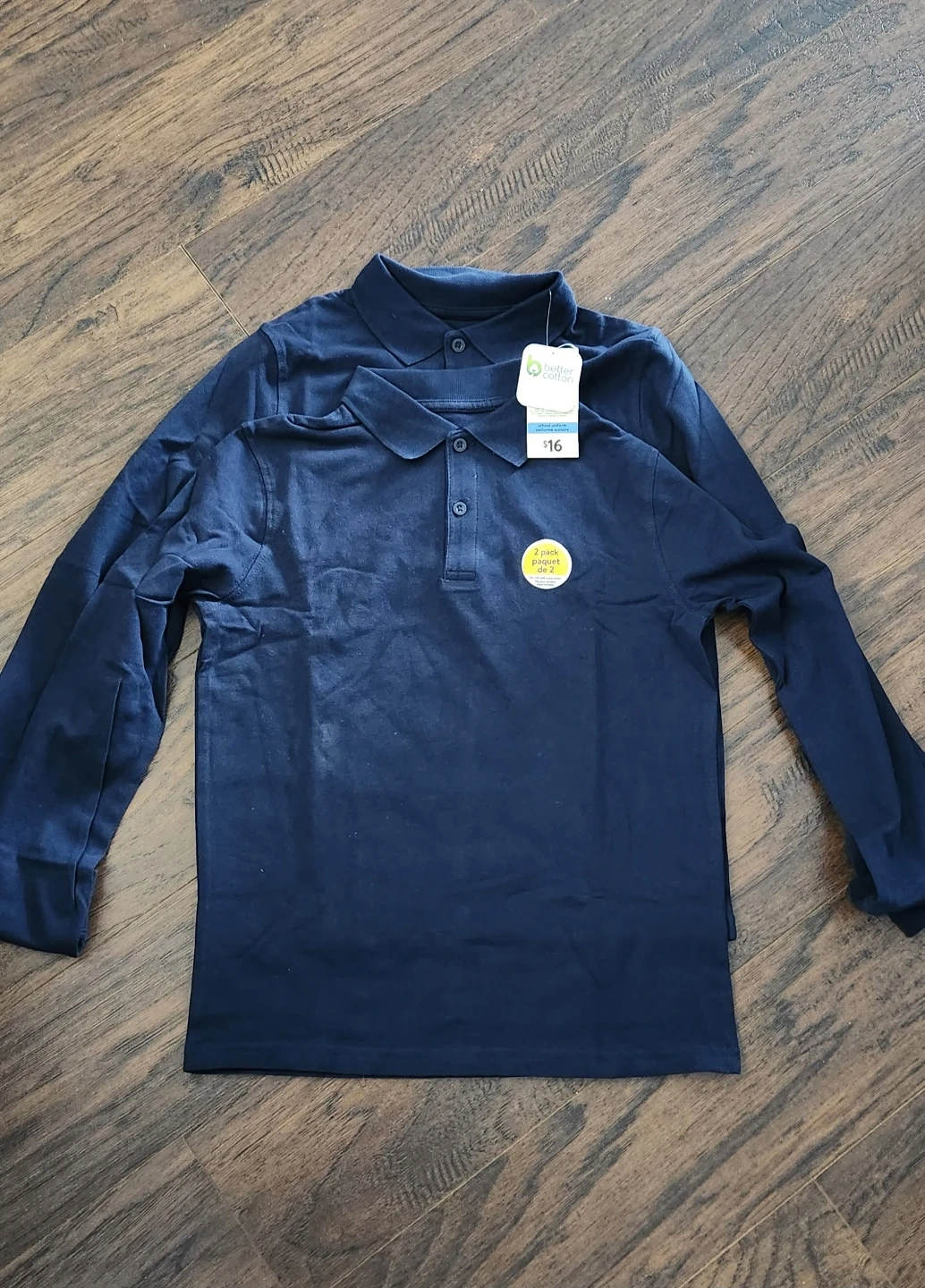 Two navy long sleeve uniform polo shirts from George. Size L/G (10-12). Made from a cotton blend.