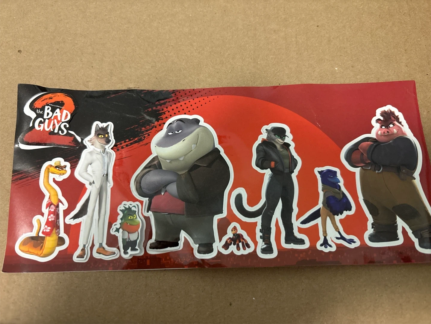 Sheet of stickers featuring characters from The Bad Guys 2 movie. Includes characters like Mr. Wolf, Diane Foxington, Mr. Shark, and more. These stickers are fun for decorating laptops, notebooks, or water bottles.
