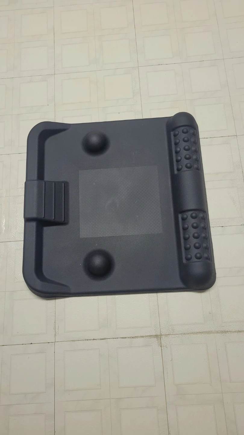 This is a dark grey anti-fatigue mat. It's made of durable material and features textured areas for foot comfort. Useful for standing desks or long periods of work!
