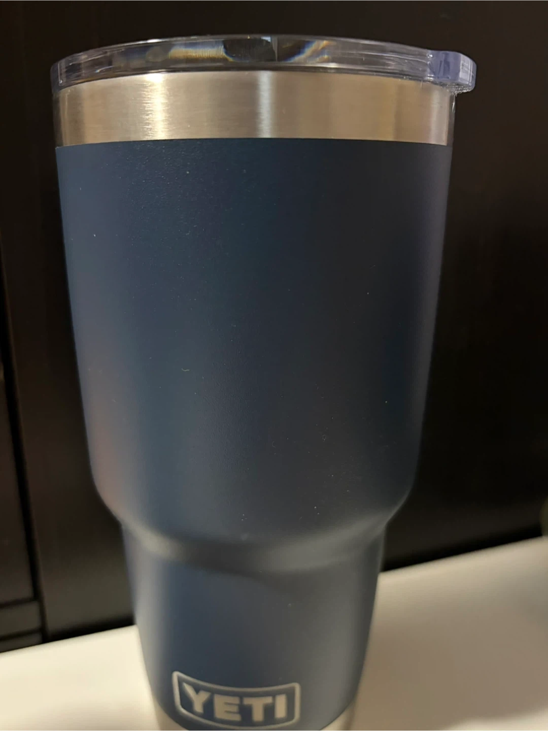This is a navy Yeti tumbler. It's made with durable material to keep your drinks cold or hot. The lid is clear with a sliding closure.