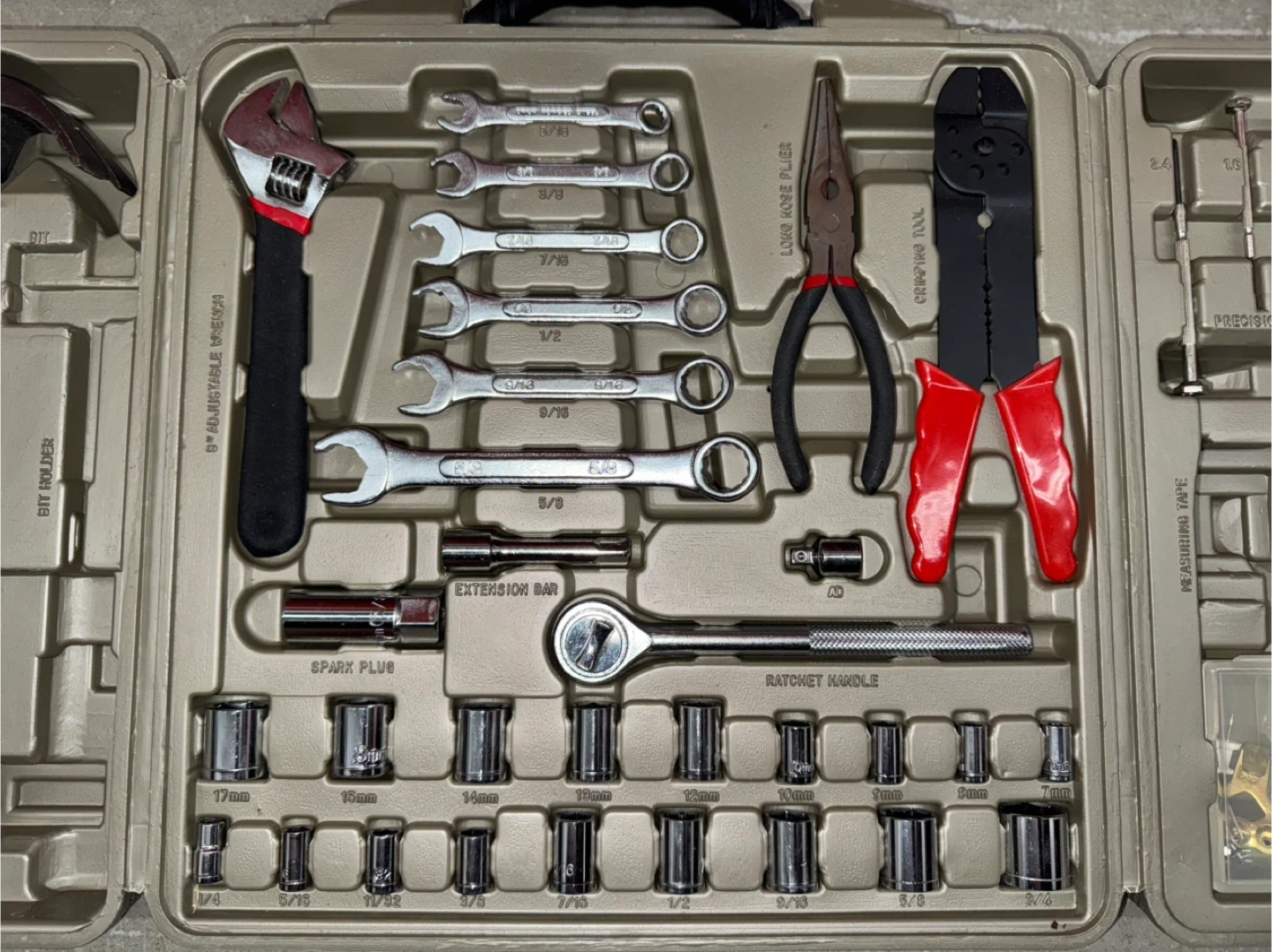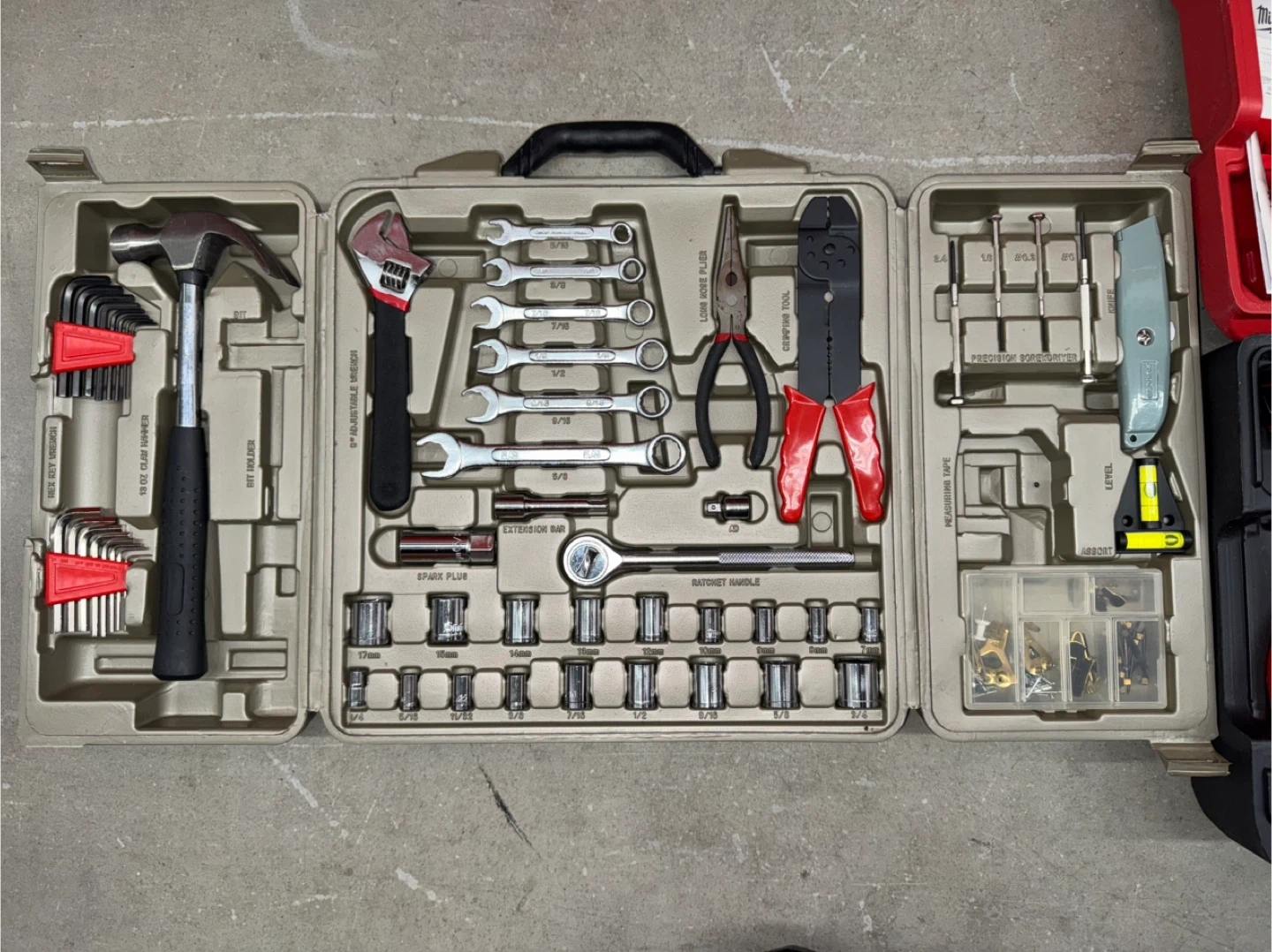 This comprehensive home tool kit includes a hammer, adjustable wrench, pliers, screwdrivers, and a variety of sockets and bits. It's perfect for everyday repairs and DIY projects around the house. The tools are housed in a durable, portable case.