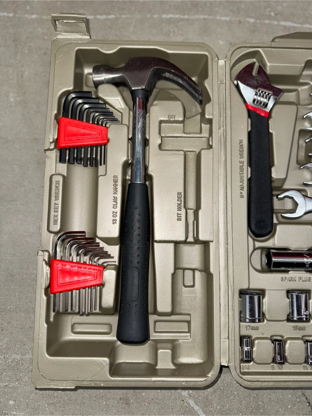 This comprehensive home tool kit includes a hammer, adjustable wrench, pliers, screwdrivers, and a variety of sockets and bits. It's perfect for everyday repairs and DIY projects around the house. The tools are housed in a durable, portable case.